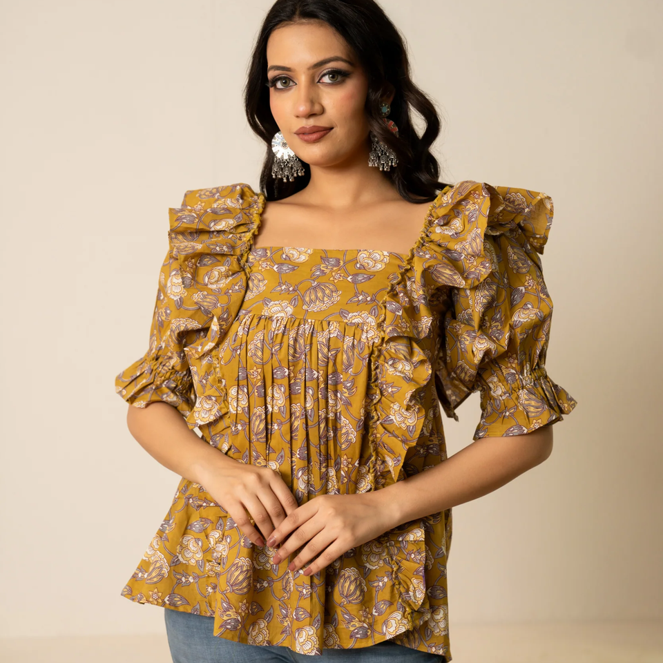 เสื้อทูนิคผ้าฝ้ายพิมพ์ลายบล็อกสีเหลืองอ่อน ซูกูน โอเชอร์ สำหรับผู้หญิง แขนพอง | เสื้อผ้าลำลองฤดูร้อนคุณภาพส่งออกขายส่ง