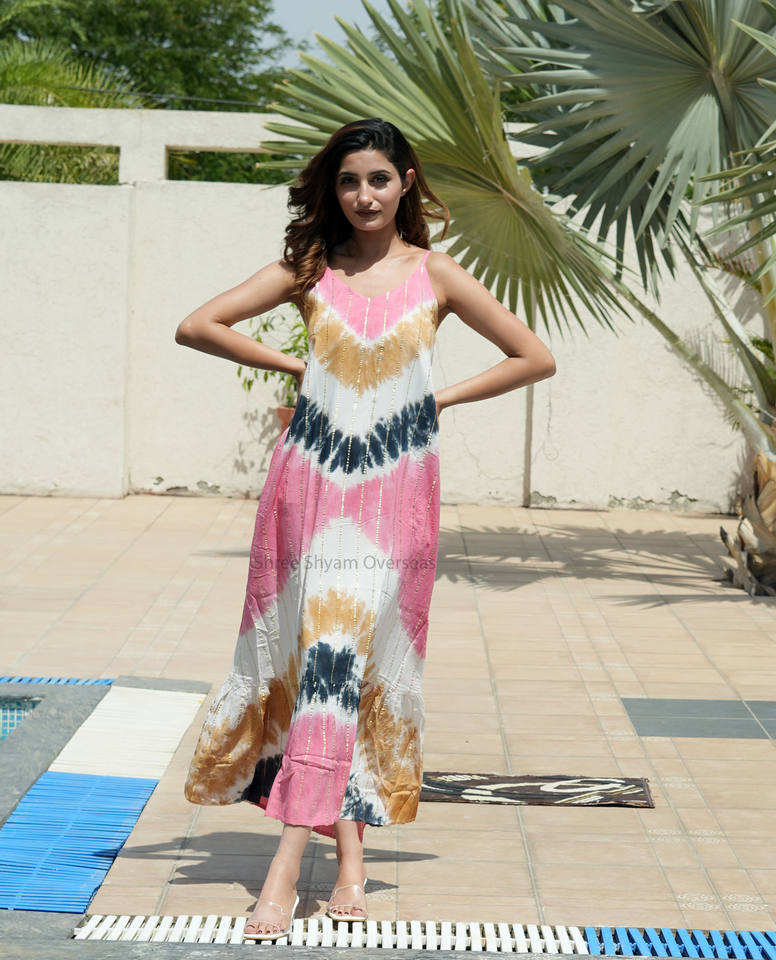 ชุดเดรสยาวสำหรับผู้หญิงชุดเดรสยาวปาเก็ตตี้ย้อมสีหลายมัดย้อมผ้าเรยอนสำหรับฤดูร้อน2024