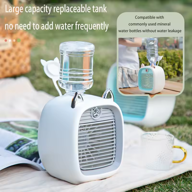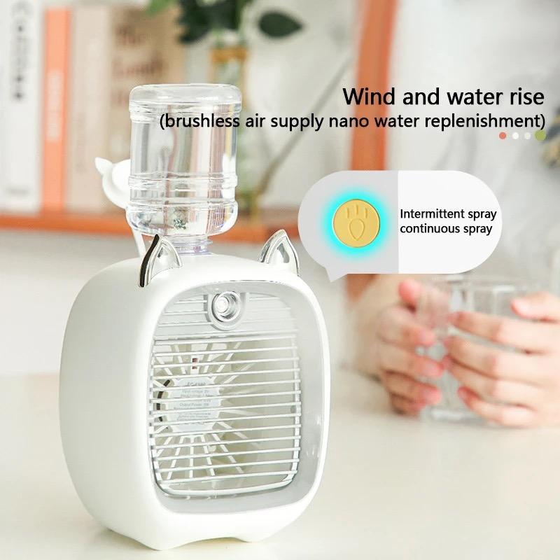 พัดลมไอเย็นแบบตั้งโต๊ะขนาดเล็ก พ่นละอองน้ำ 3 ระดับลมแรง ใช้พอร์ต USB ดีไซน์รูปสุนัขจิ้งจอก วัสดุพลาสติก สำหรับใช้ในบ้านและสำนักงาน