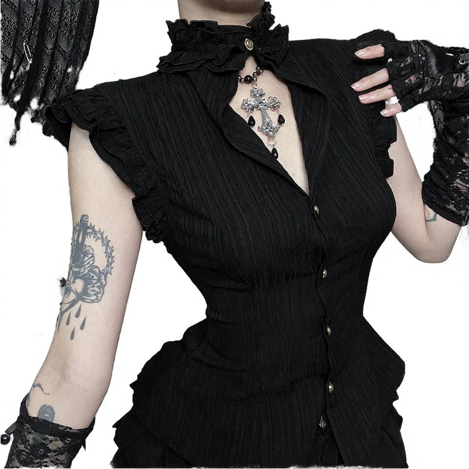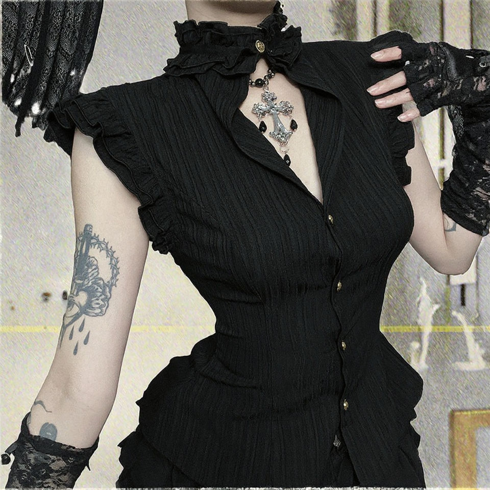 เสื้อถักเนื้อผ้าทึบ ระบายอากาศได้ดี สไตล์โกธิควินเทจ คอตั้งติดกระดุม ดีไซน์ระบาย แต่งระบาย ทรงเข้ารูป สำหรับผู้หญิง เหมาะสำหรับฤดูร้อนและฤดูใบไม้ร่วง