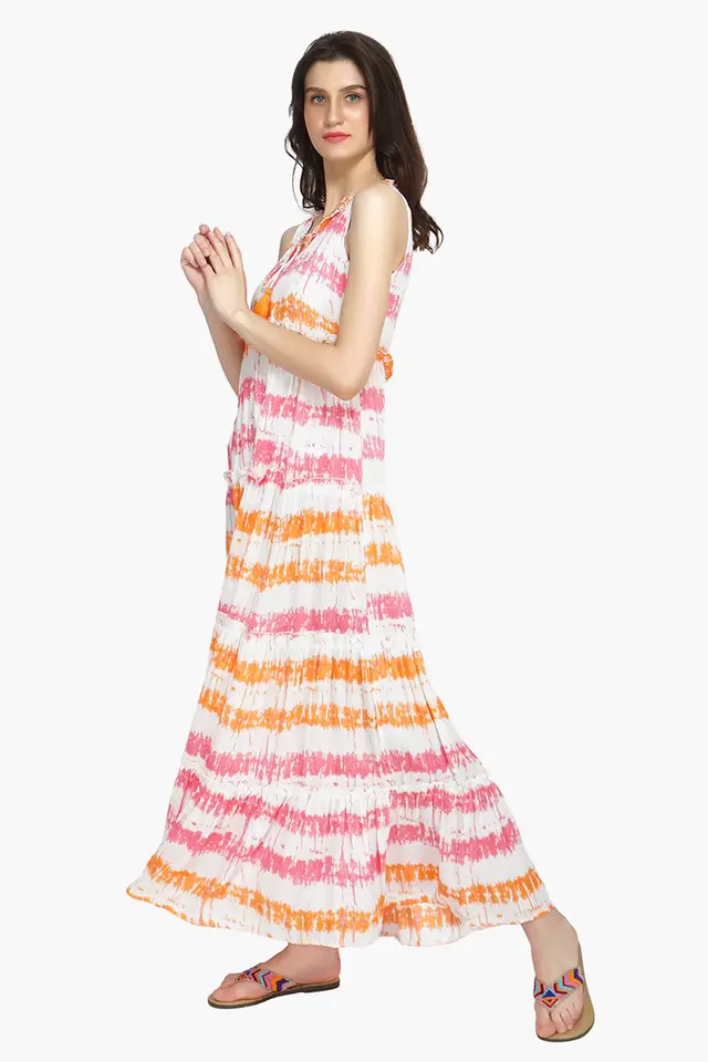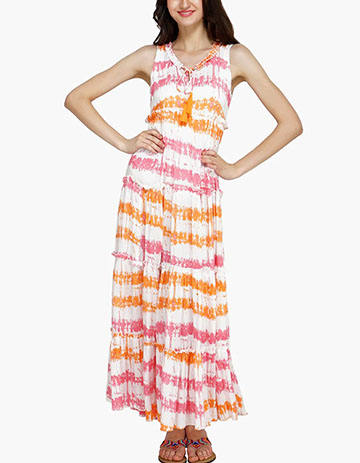 ชุดชายหาดฤดูร้อนคอลเลกชันยอดนิยมใหม่สำหรับผู้หญิงเดรสแขนกุดคอวียาวผ้ามัดย้อมผ้าเรยอน