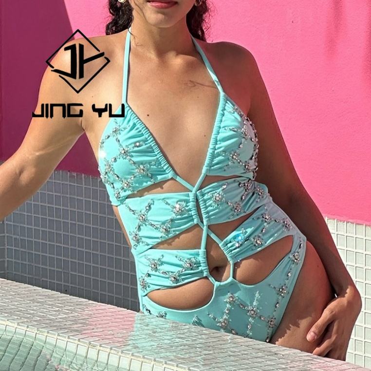 ชุดว่ายน้ำวันพีซประดับคริสตัลแบบโปร่งสำหรับฤดูร้อน ชุดว่ายน้ำวันพีซผ้าไนลอนรีไซเคิลสั่งทำพิเศษสำหรับผู้หญิง