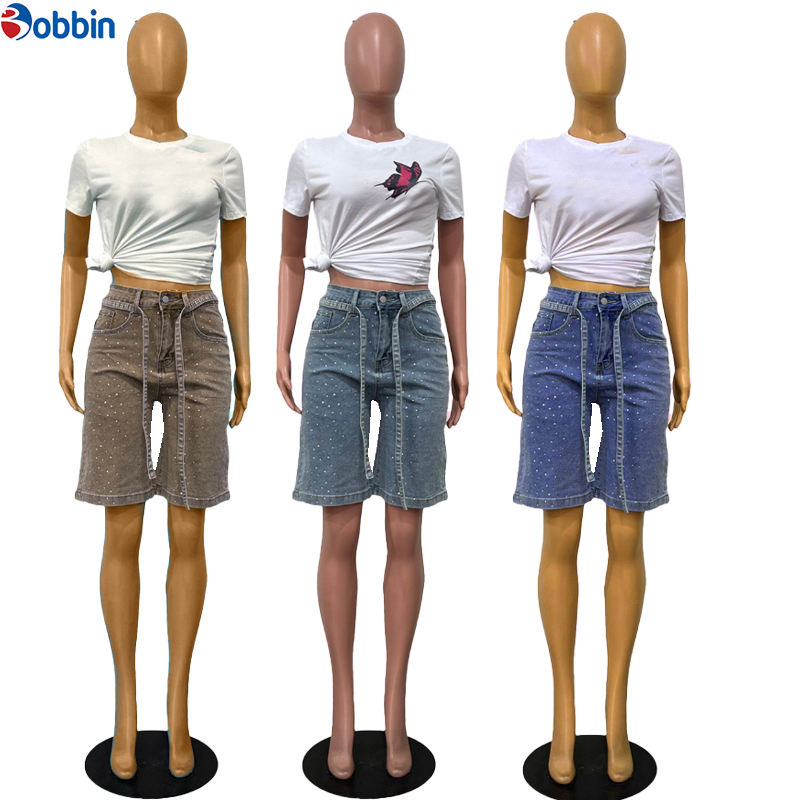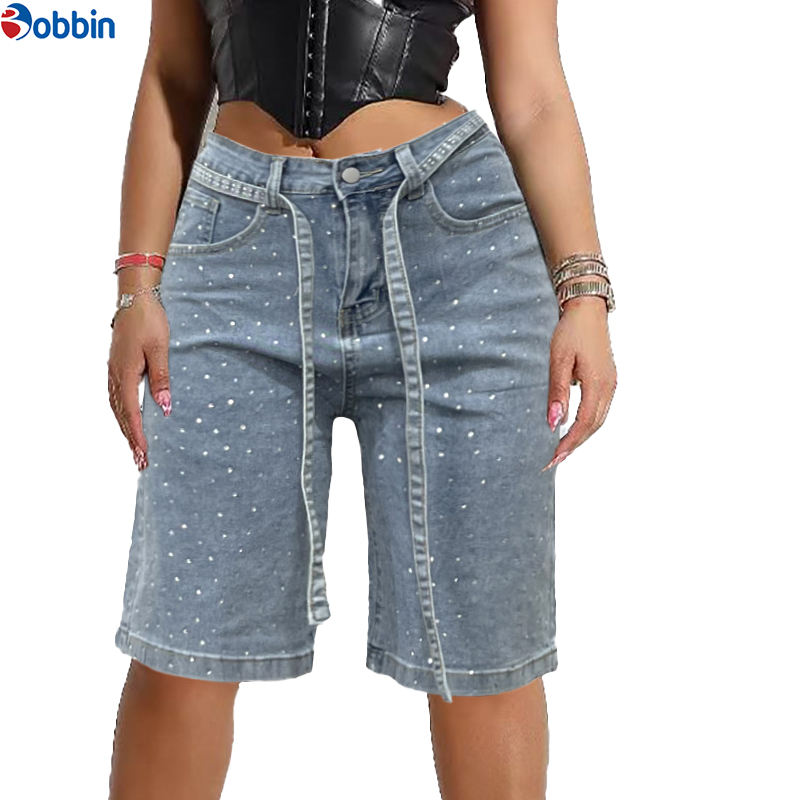 กางเกงยีนส์ขาสั้นสไตล์ลำลองสำหรับฤดูร้อน แต่งกระเป๋าคาดเอว ฮิปฮอป ประดับเพชร ทรงตรง ผ้ายีนส์ฟอกสี ความยาวระดับเข่า สำหรับผู้หญิง