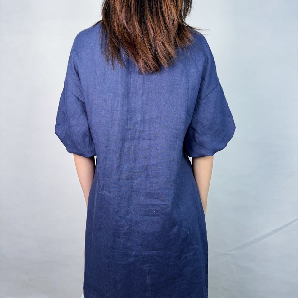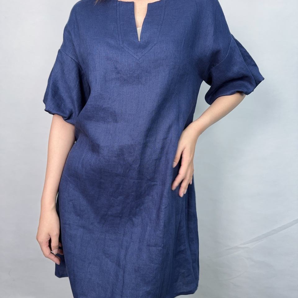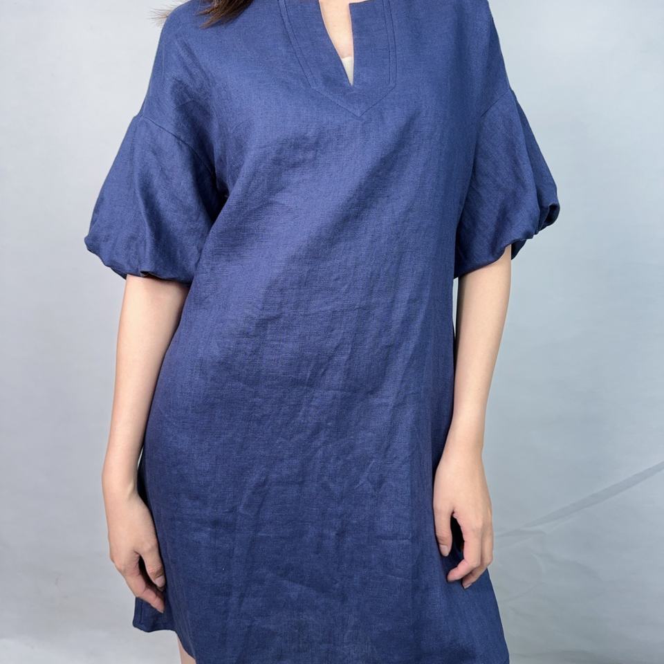 เดรสผ้าลินินสไตล์ลำลองสำหรับผู้หญิง รุ่นซัมเมอร์บลู แขนสั้น ความยาวปานกลาง แบบสั่งตัดได้