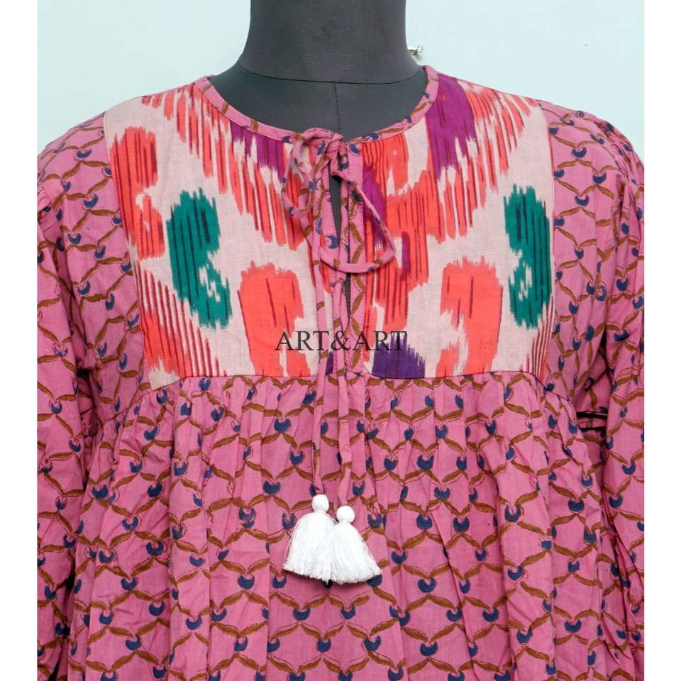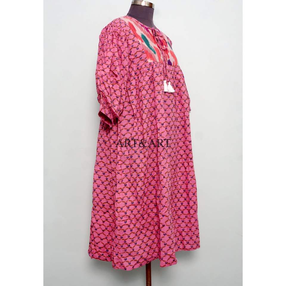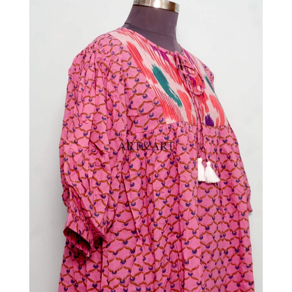ชุดเดรสทรงเอไลน์ลายดอกไม้หวานๆ สไตล์โบฮีเมียนสำหรับฤดูร้อน 2 ชิ้น ผ้าฝ้าย 100% คอวี แต่งพู่ แขน 3/4 ทรงหลวม สวมใส่สบาย ซักได้