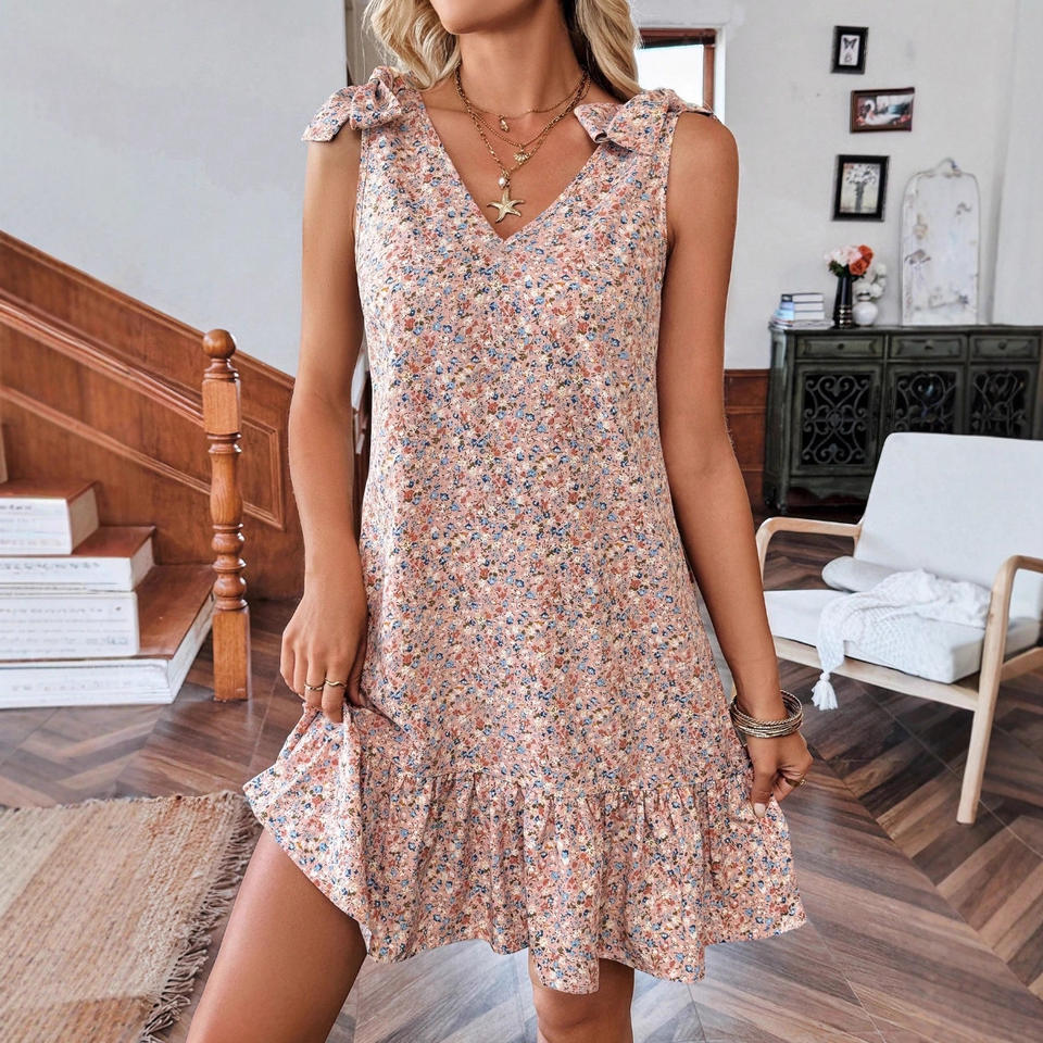 เดรสสั้นทรงเอ คอวี ลายดอกไม้สไตล์โบฮีเมียน สำหรับฤดูร้อน สายเดี่ยว ระบายช่วงเอวสูง ระบายอากาศได้ดี เหมาะสำหรับงานปาร์ตี้