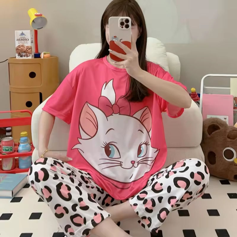 ชุดนอนฤดูร้อนลายการ์ตูนสำหรับผู้หญิง ชุดสองชิ้น เสื้อแขนสั้น กางเกงขายาว คอกลม ชุดนอน ชุดอยู่บ้าน