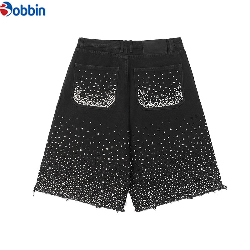 ผู้ผลิตเสื้อผ้ากางเกงยีนส์ขาสั้นสไตล์ฮิปฮอปลำลองสำหรับฤดูร้อน กางเกงยีนส์ขาสั้นทรงหลวมประดับเพชรแบบวินเทจสั่งทำพิเศษสำหรับผู้ชาย