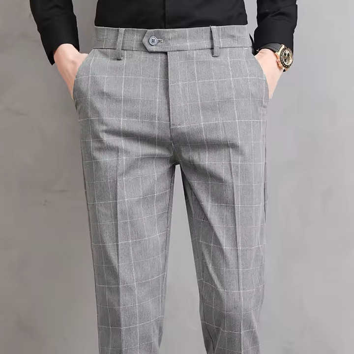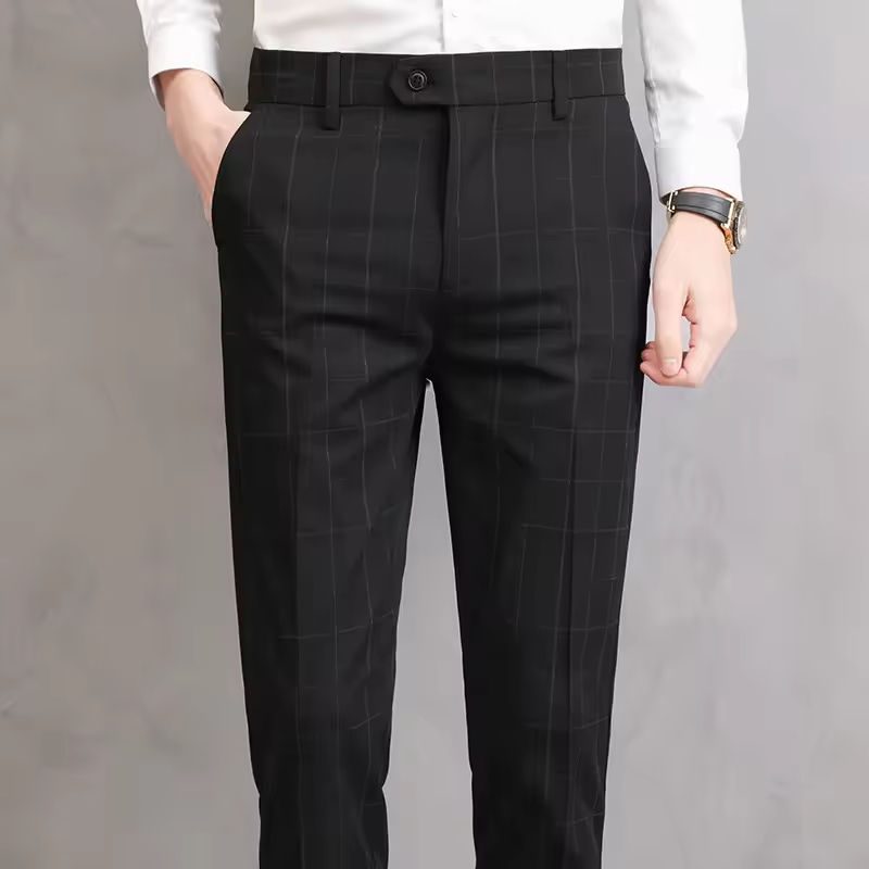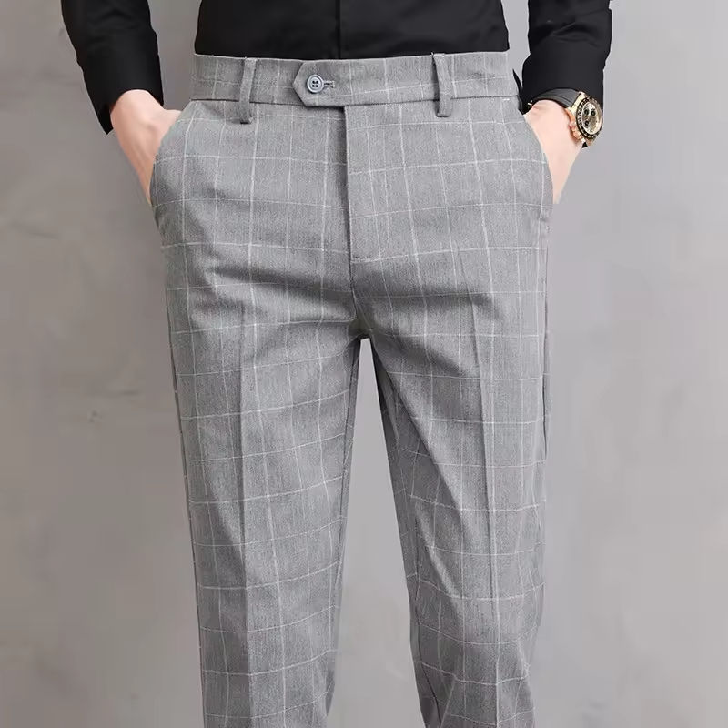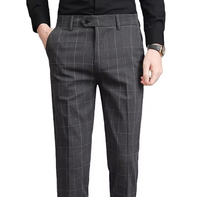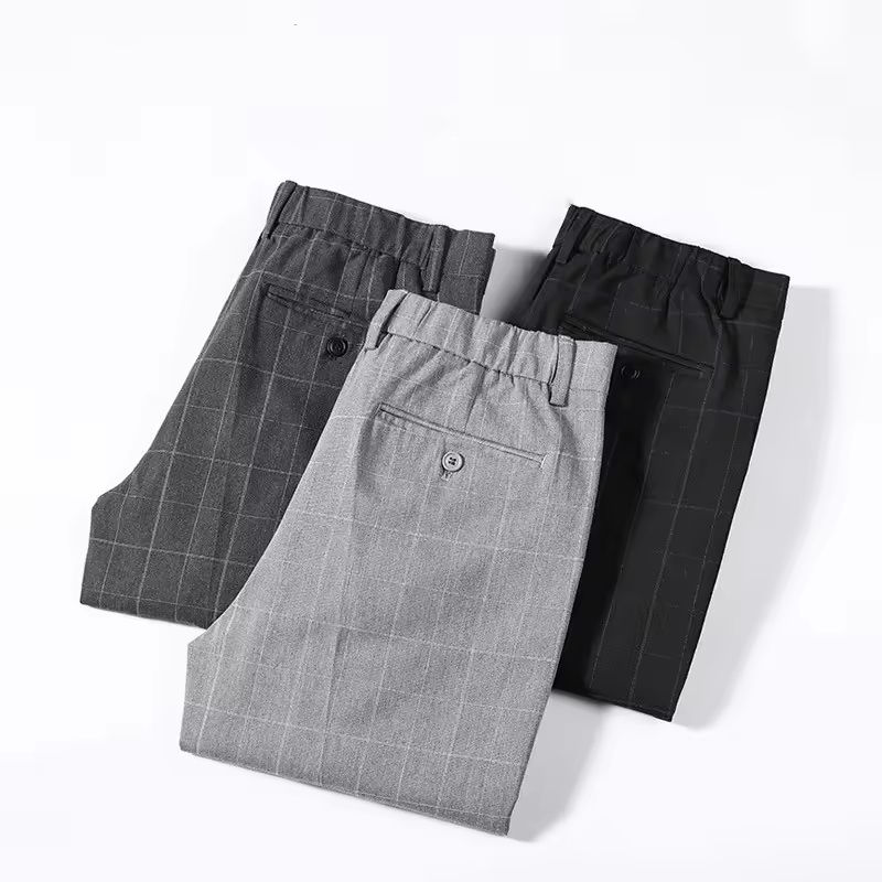กางเกงขายาวลายตารางหมากรุกของผู้ชายสำหรับฤดูร้อนกางเกงขาตรงขนาดเล็กทรงสลิมฟิตแบบเกาหลีกางเกงขายาวผ้ายืดแฟชั่น