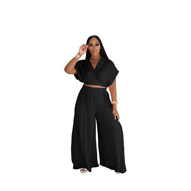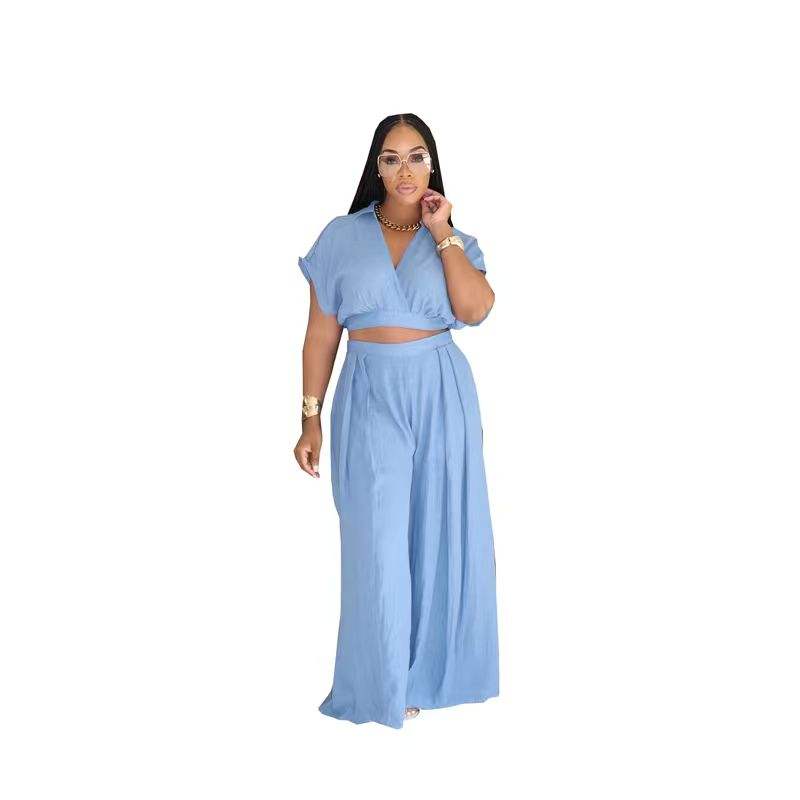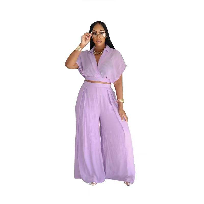 ชุดเสื้อครอปฤดูร้อน / กางเกงขายาวเอวสูงทรงขากว้าง พร้อมปกเสื้อแบบน่ารัก ดีไซน์ปกเสื้อแบบมีปก ความยาวสั้น ผ้าถักลำลอง
