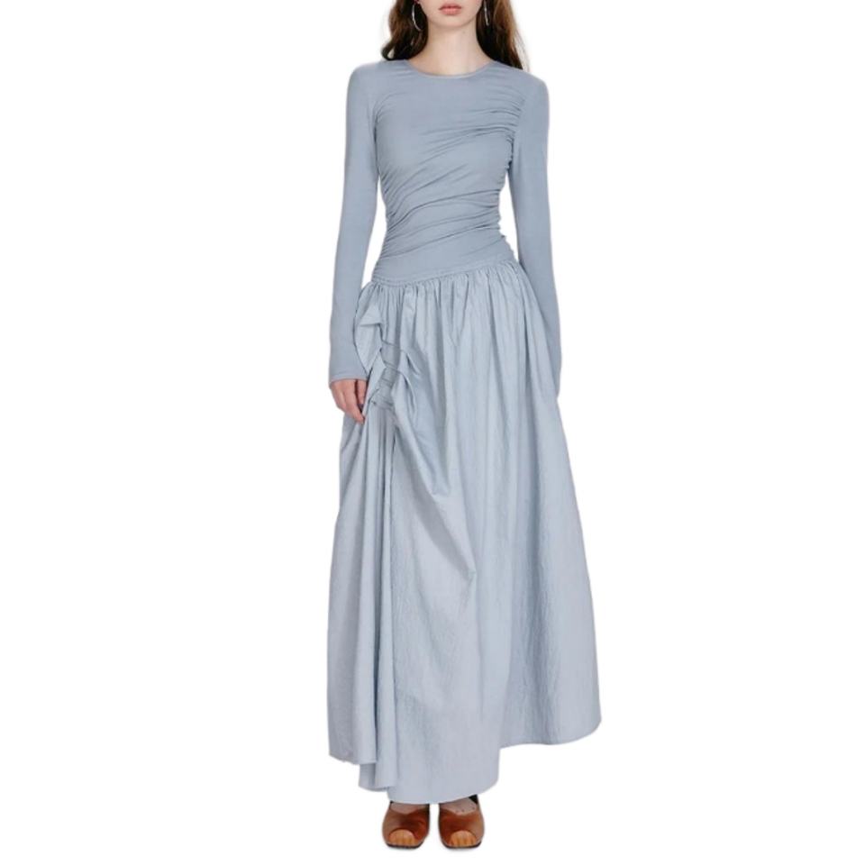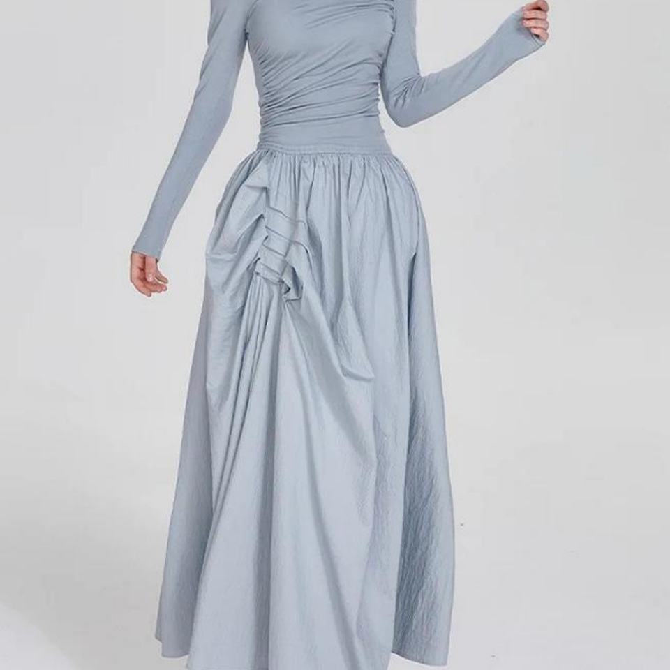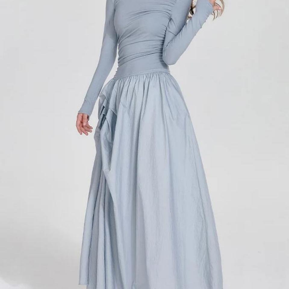 เดรสฤดูร้อนผู้หญิง สีน้ำเงิน แขนยาว ทรงเข้ารูป กระโปรงบานยาว ดีไซน์หรูหรา จับจีบ คอทรงกลม