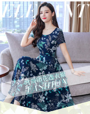 ชุดเดรสฤดูร้อนผู้หญิง แขนสั้น ลายดอกไม้ คอกลม ความยาวปานกลาง สำหรับผู้หญิง