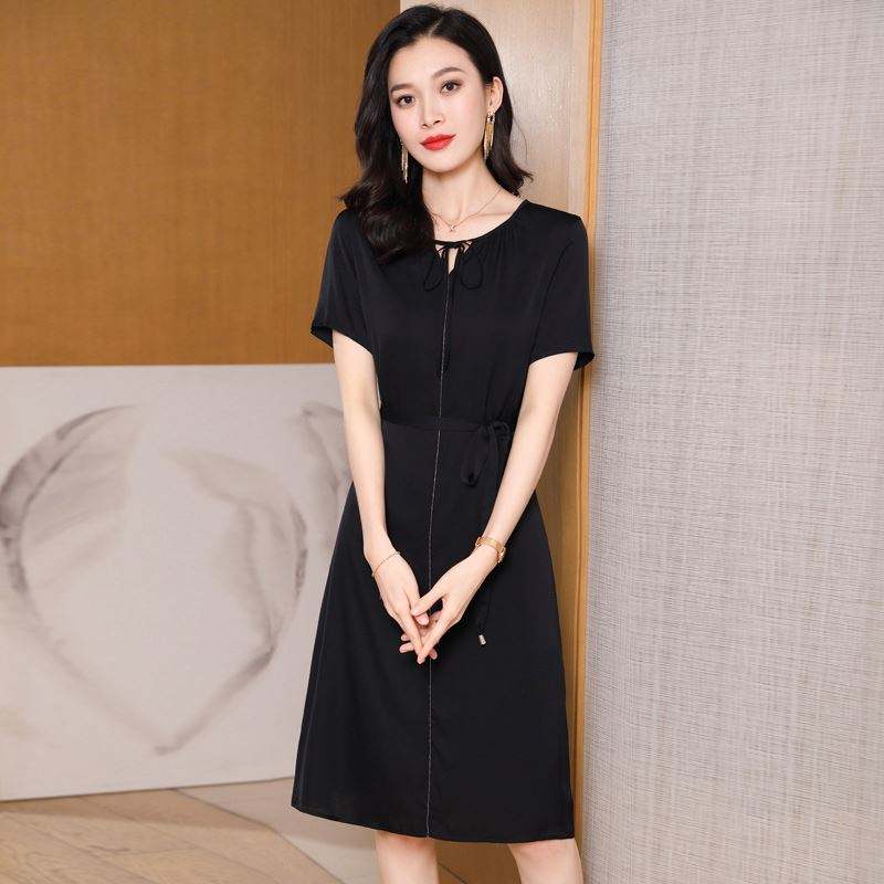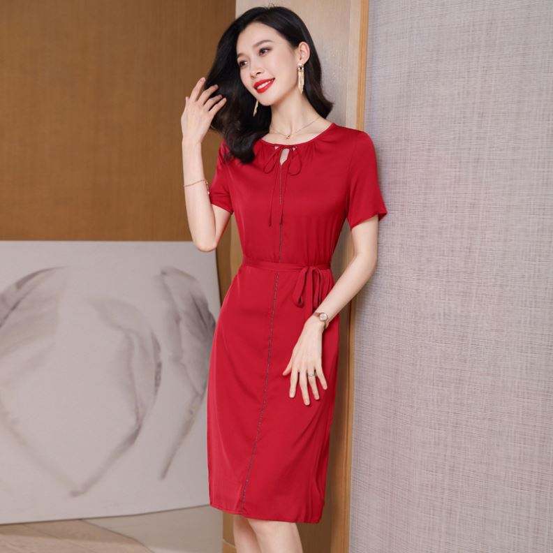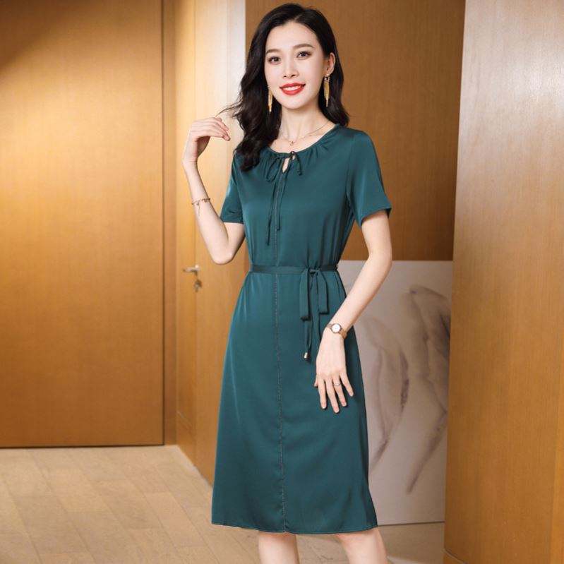 เดรสผ้าไหมยาวปานกลางคอวีหรูหราสำหรับผู้หญิงดีไซน์เนอร์เอวสูงเข้ารูปเอวสูงธรรมชาติ