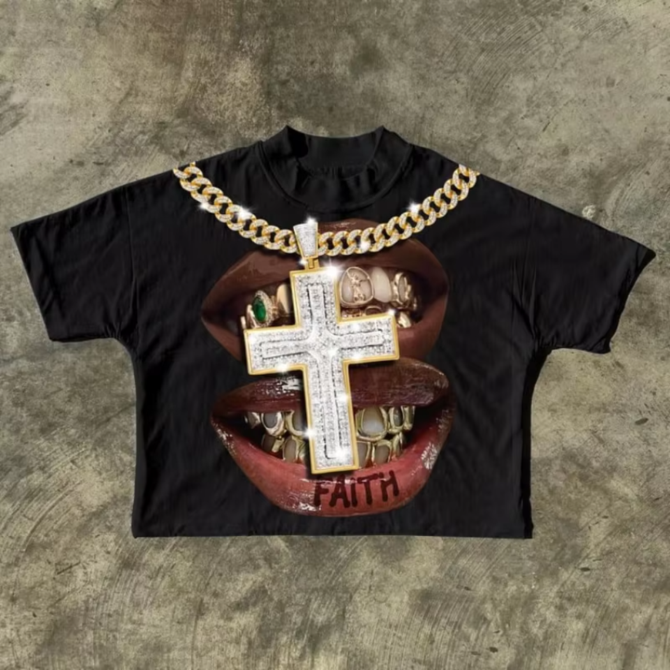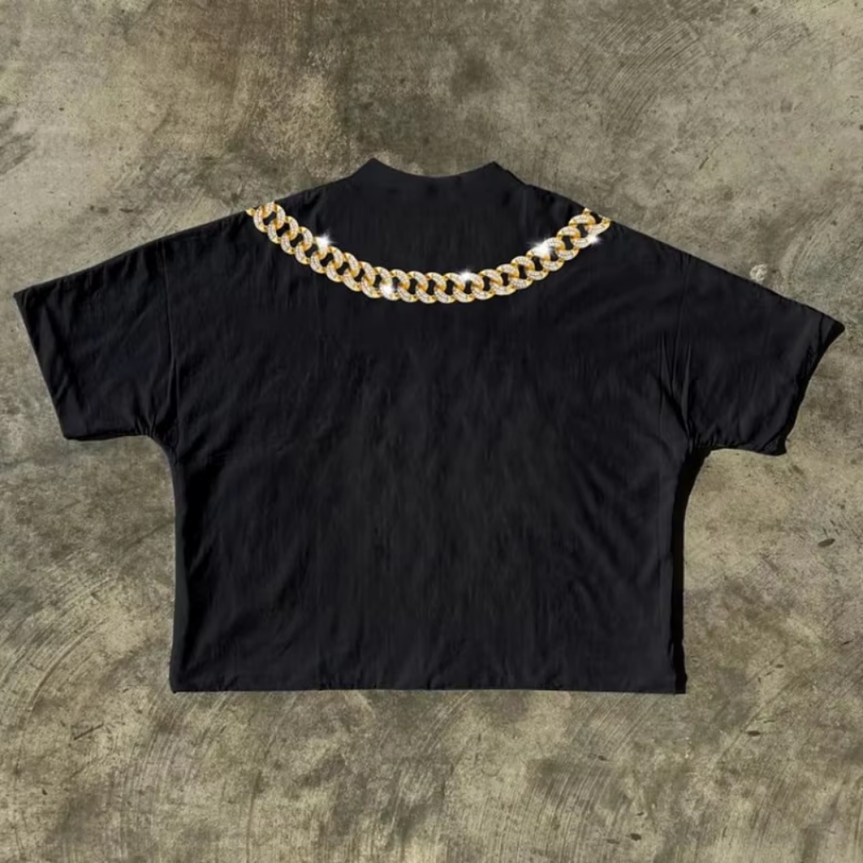 เสื้อยืดลายชนเผ่าฤดูร้อนสำหรับผู้ชายสร้อยคอประดับเพชรย้อนยุครูปริมฝีปากแขนสั้นทันสมัยสไตล์ไฮสตรีทแรงบันดาลใจจาก Y2K