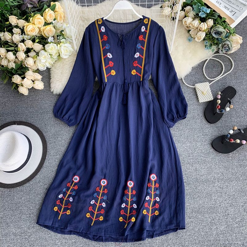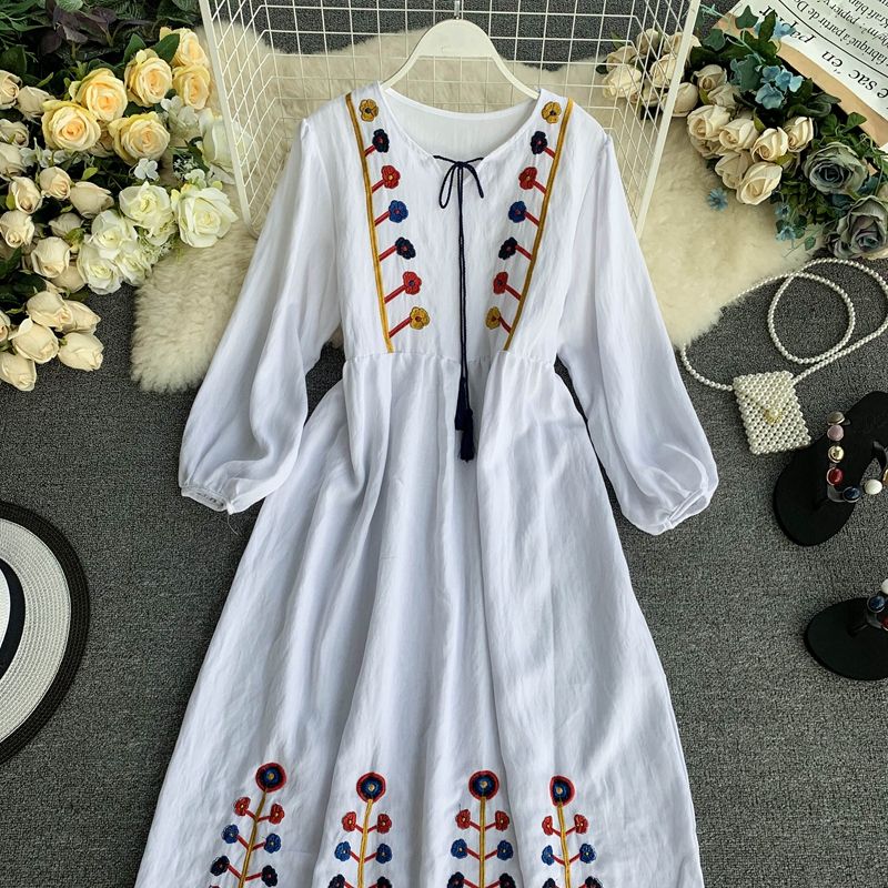 ชุดเดรสยาวถึงพื้นปักลายดอกไม้สำหรับผู้หญิงแฟชั่นฤดูร้อนผ้าคอตตอน100% สไตล์เม็กซิกันปักลายดอกไม้