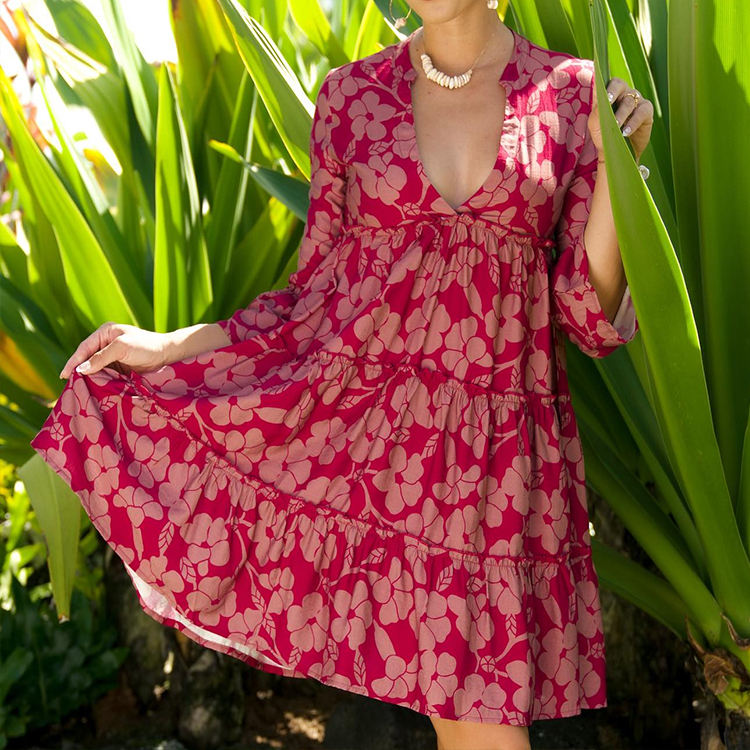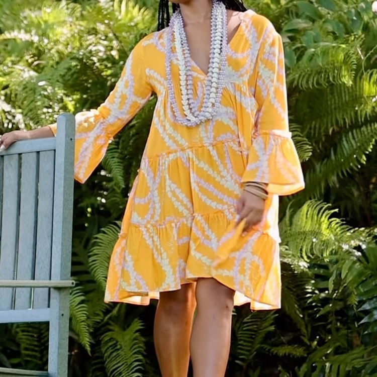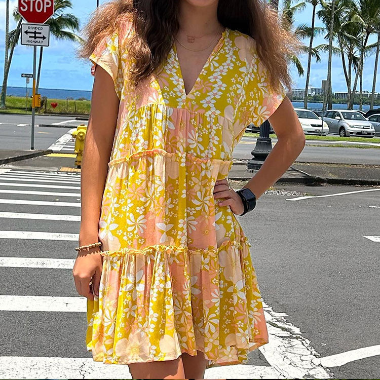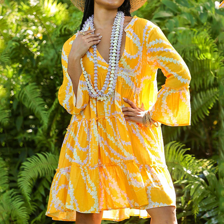 ชุดเดรสฮาวายลายพิมพ์ชายหาดแฟชั่นฤดูร้อน คอวีลึก แขนบาน หลายชั้น ผ้าฝ้ายสั่งทำ ชุดลำลอง