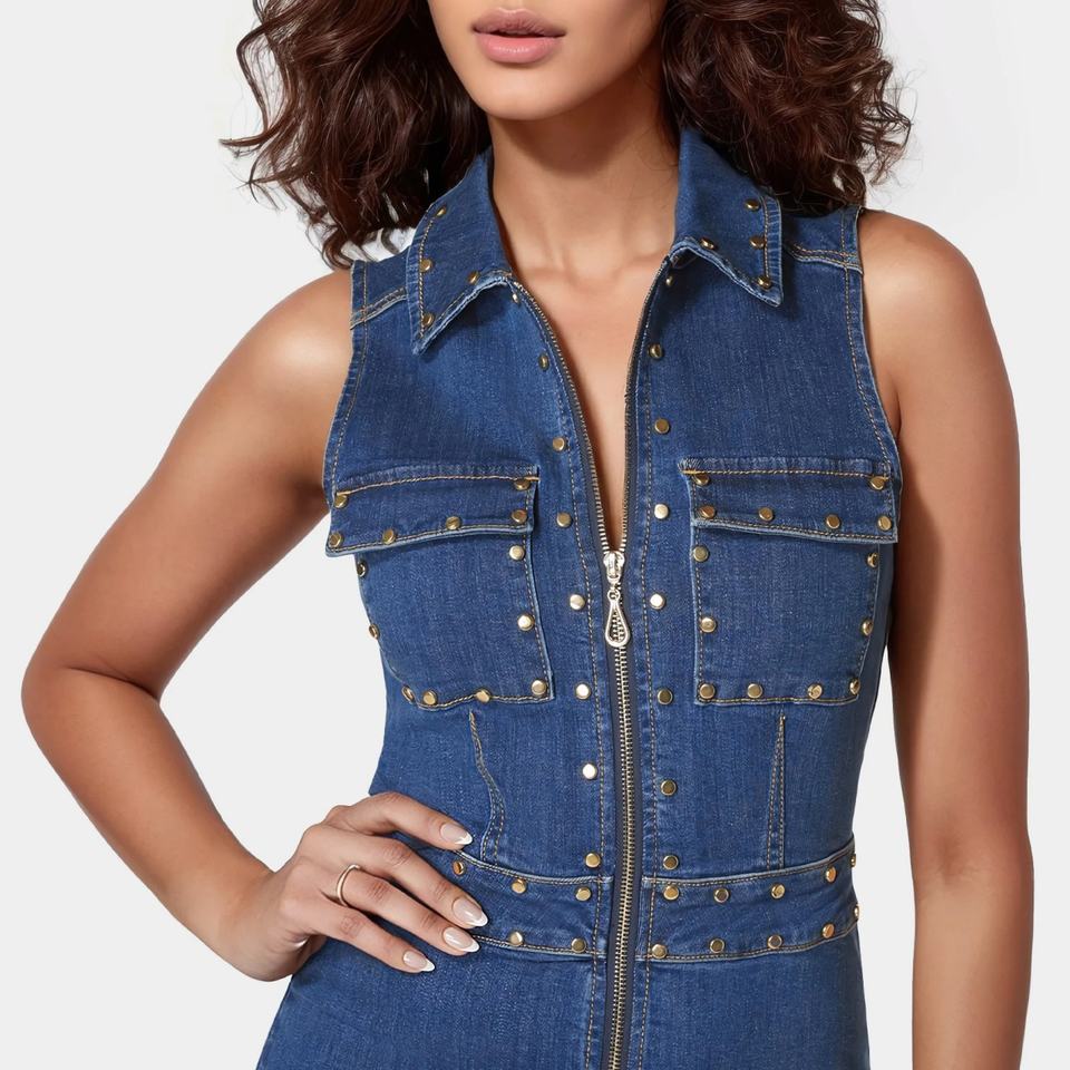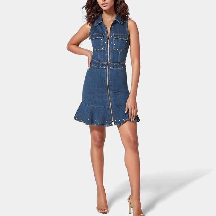 เดรสยีนส์ทรงเข้ารูปแขนกุดแฟชั่นฤดูร้อนใหม่ แต่งหมุดสีเทากันเมทัล ซิปหน้า ปกคอพับ แต่งระบาย กระโปรงสั้นสำหรับผู้หญิง