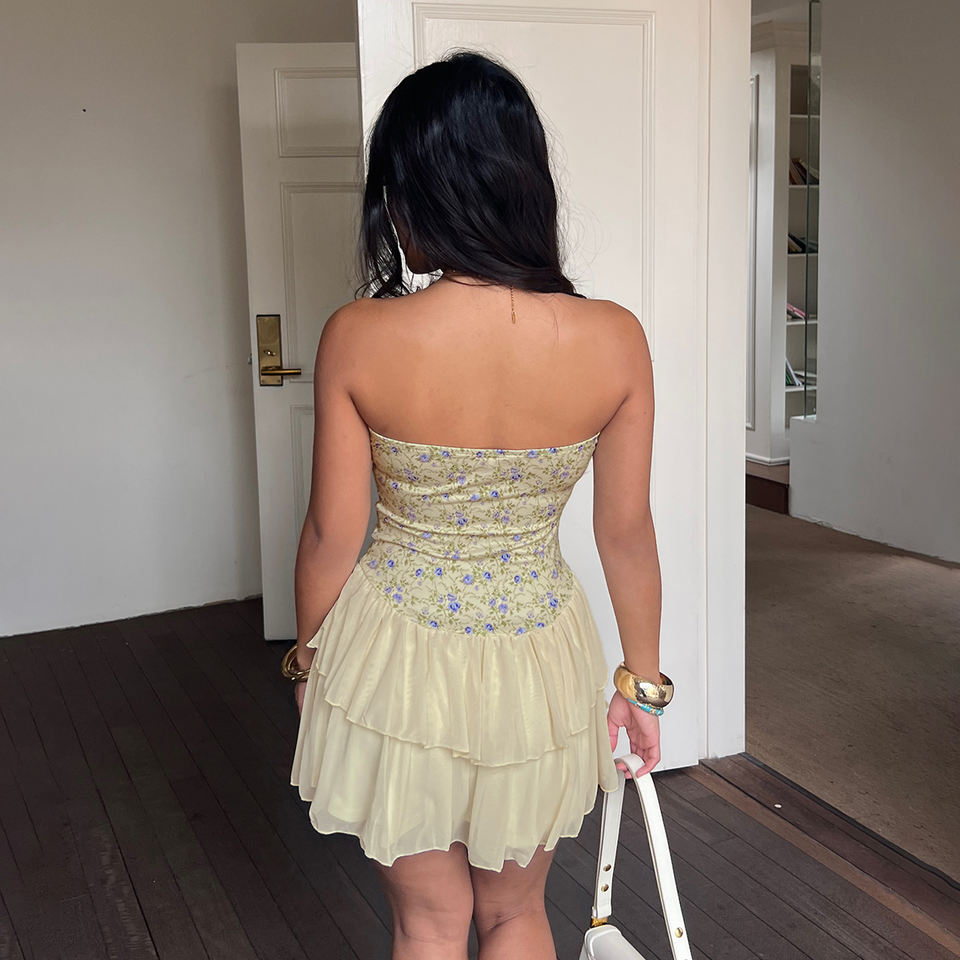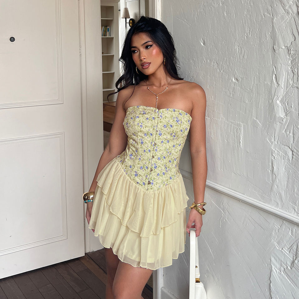 ชุดเดรสทรงคอร์เซ็ทลายดอกไม้ฤดูร้อน ปิดด้วยตะขอ แบบเปิดไหล่ กระโปรงมินิทรงหลายชั้น ลายพิมพ์ดิจิทัลแบบบล็อกสี เอวธรรมชาติ เป็นมิตรกับสิ่งแวดล้อม