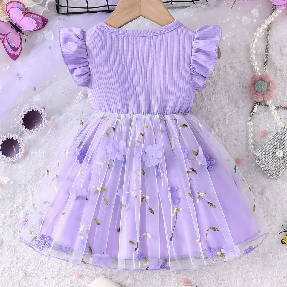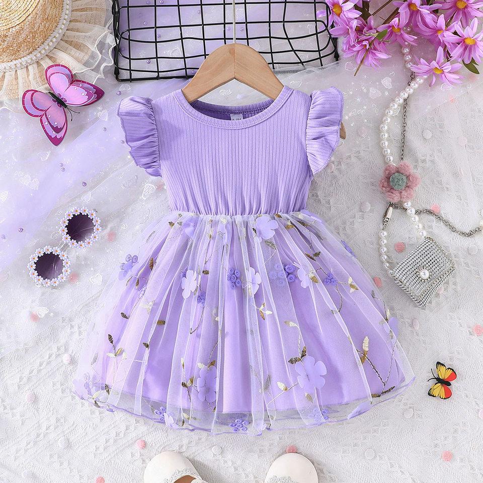 ชุดเดรสตาข่ายสำหรับเด็กผู้หญิงคอกลมแขนบินได้สำหรับฤดูร้อน ชุดเดรสอเนกประสงค์แฟชั่นอินเทรนด์