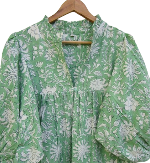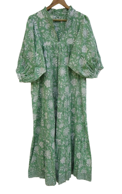 เดรสสั้นลายชนเผ่าสีเขียวฤดูร้อนสำหรับผู้หญิง คอทรงโอ แขนสามส่วน ติดกระดุมด้านหน้า สไตล์โบฮีเมียนลำลอง เป็นมิตรกับสิ่งแวดล้อม ดีไซน์หวาน