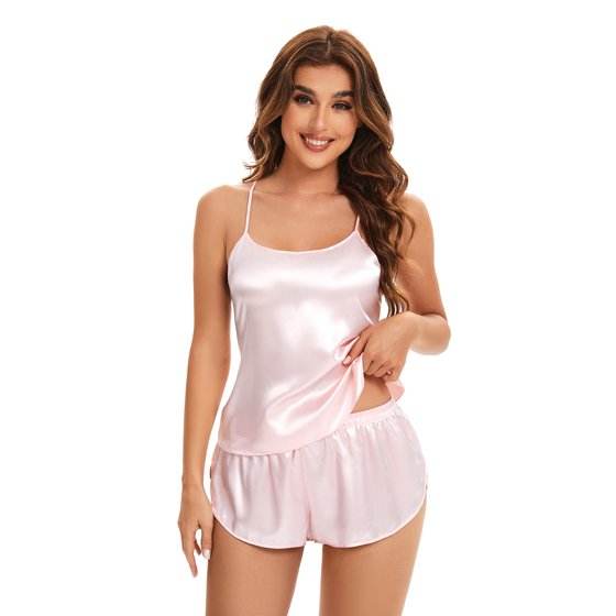 ชุดนอนผูกโบว์ลายหัวใจเซ็กซี่สำหรับฤดูร้อนชุดนอนของผู้หญิงเสื้อเอวลอยสวมใส่สบายและกางเกงขาสั้น