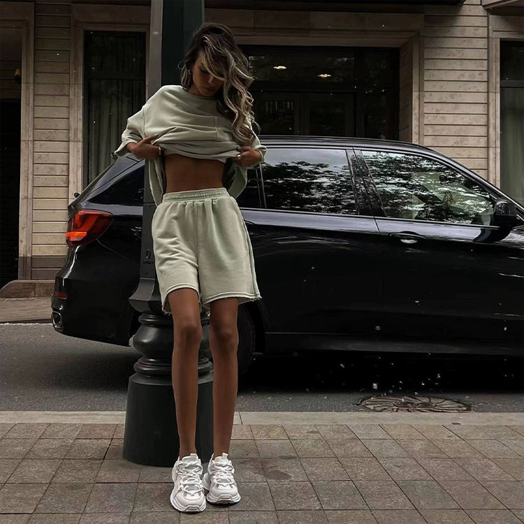 ชุดเสื้อผ้าสองชิ้นเอวสูงสำหรับผู้หญิงเสื้อครอปถักแบบเซ็กซี่แขนกุดกางเกงขาสั้นมีกระดุมอัดพลีทแบบทางการสำหรับฤดูร้อน