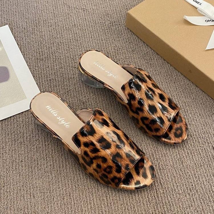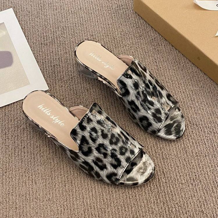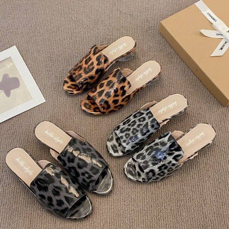 รองเท้าแตะส้นสูงปานกลางพิมพ์ลายเสือดาวสำหรับผู้หญิง, สินค้ามาใหม่รองเท้าแตะส้นหนาเซ็กซี่หรูหราสำหรับฤดูร้อน