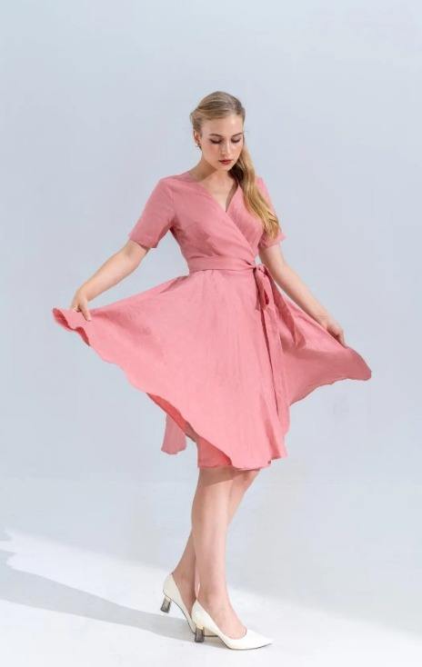 Summer Linen Dress, Linen Wrap Dress, Linen Midi Dress, Vintage Pink Linen Dress, Short Sleeve Linen Dress, Christmas Gift