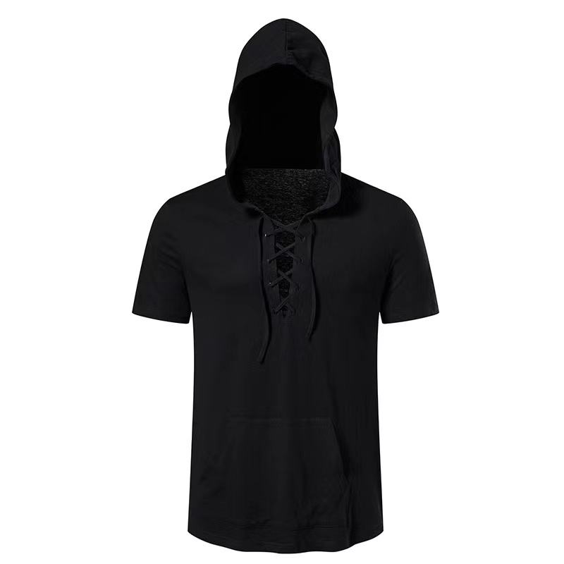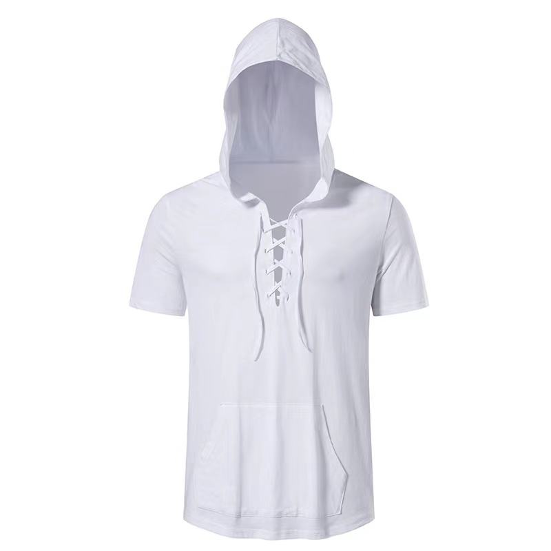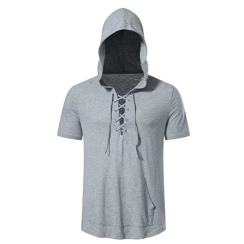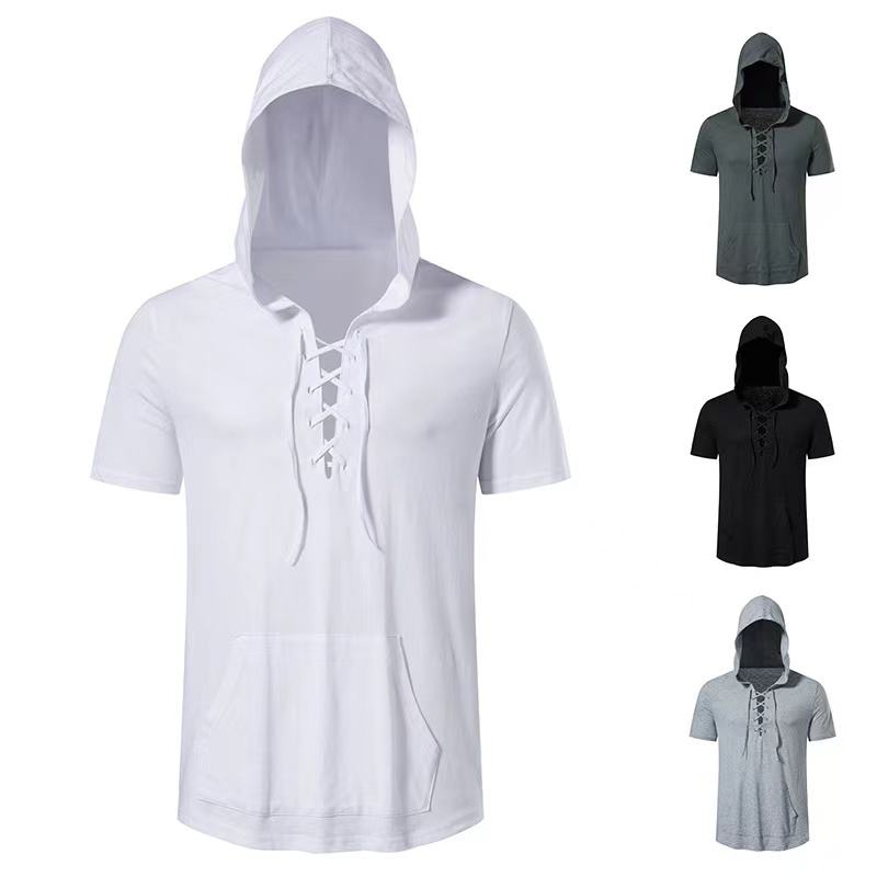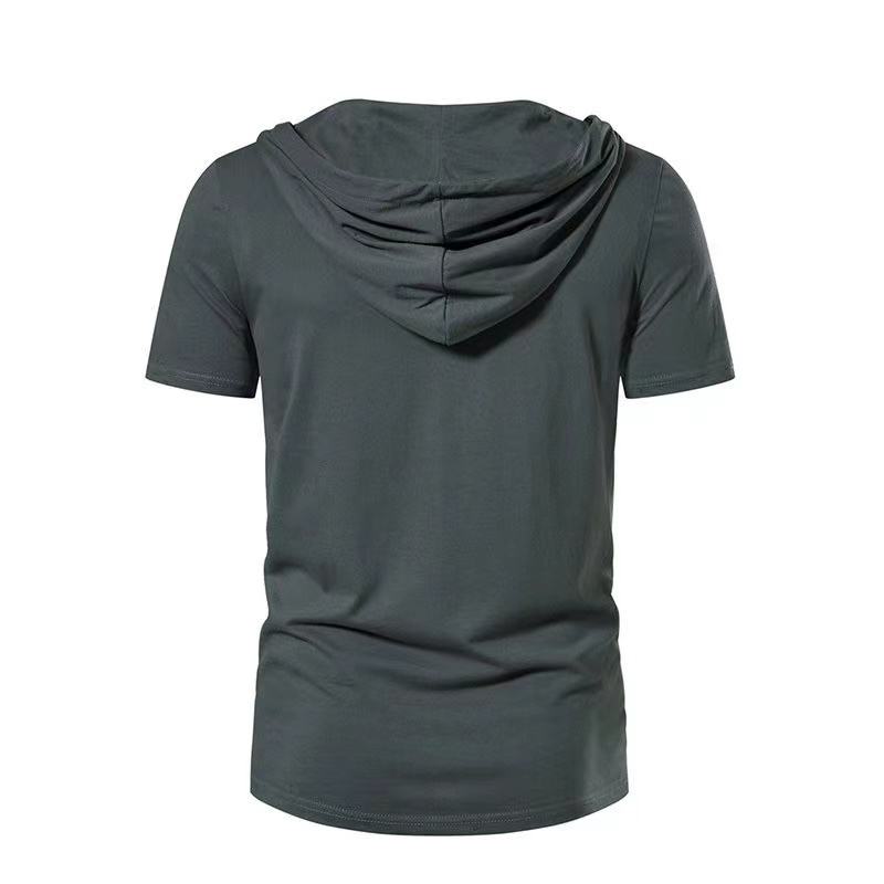 เสื้อยืดมีฮู้ดทรงหลวมสีพื้นลำลองสำหรับผู้ชายฤดูร้อนเสื้อยืดวิ่งสำหรับผู้ชายชุดกีฬาใหม่