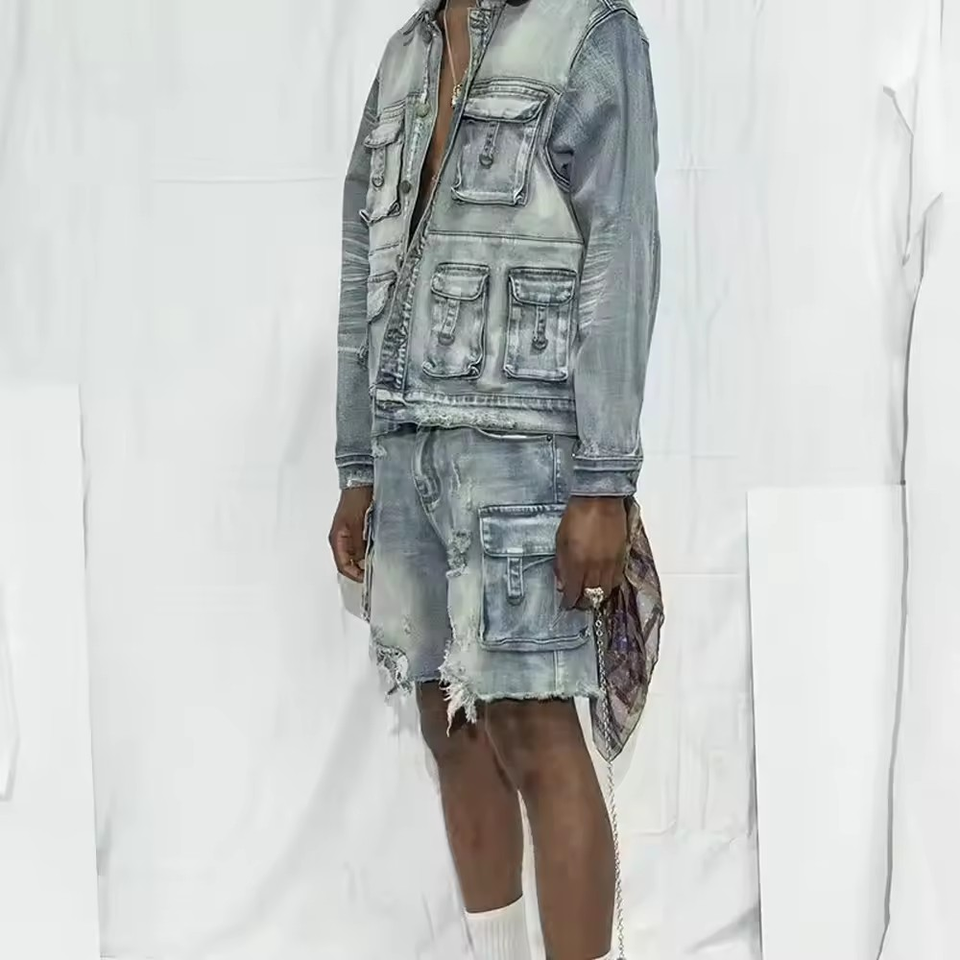 กางเกงขาสั้นผ้ายีนส์ผู้ชายสำหรับฤดูร้อนพร้อมกางเกงสไตล์สตรีทคุณภาพสูงดีไซน์หัวใจโครเมี่ยม