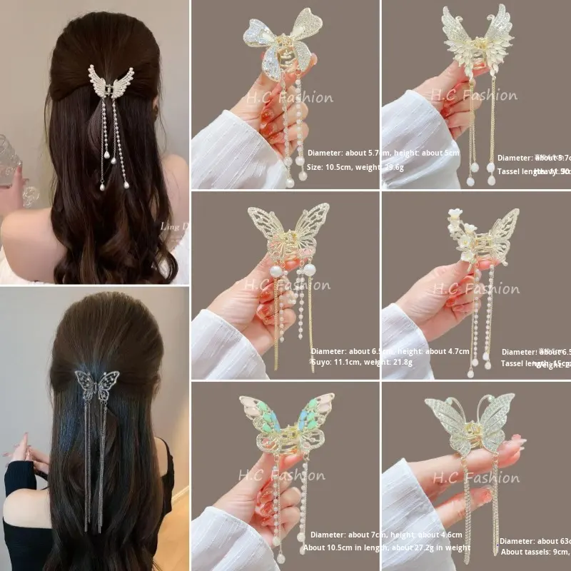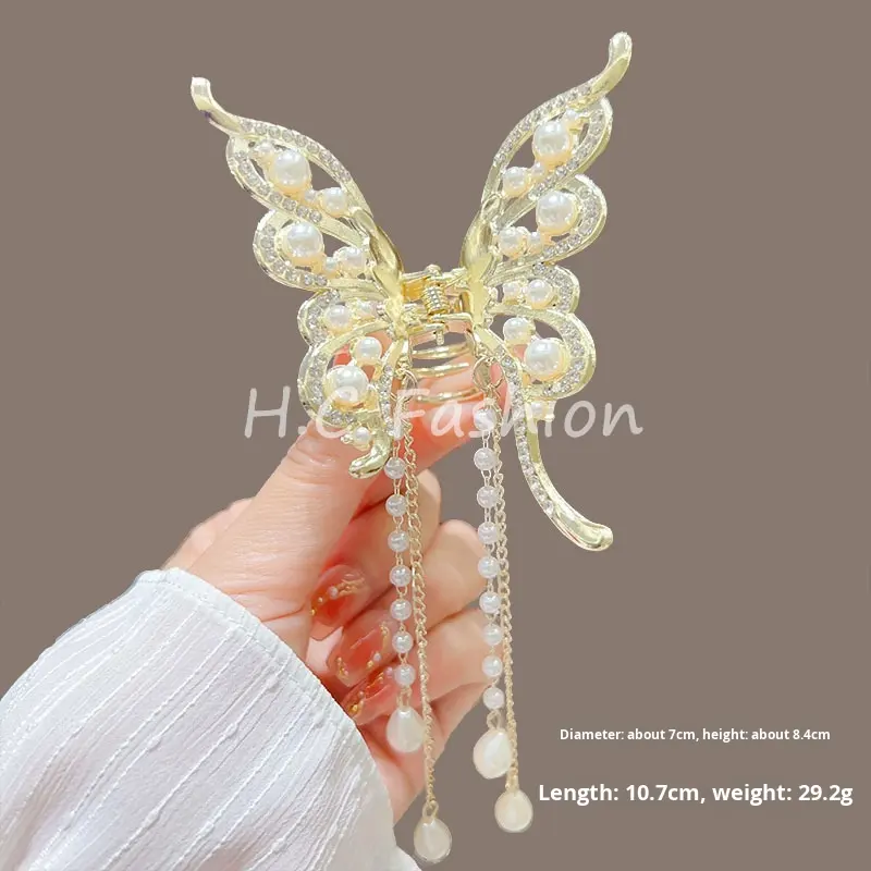 กิ๊บหนีบผมโลหะสำหรับผู้หญิงสำหรับฤดูร้อนปิ่นปักผมไข่มุกประดับด้วยเม็ดเพชรด้านหลังมีพู่รูปผีเสื้อวัสดุอัลลอย