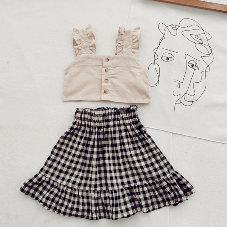 ชุดเสื้อผ้าเด็กผู้หญิงสำหรับฤดูร้อน อายุ 3-8 ปี เสื้อครอปและกระโปรงลายสก็อต