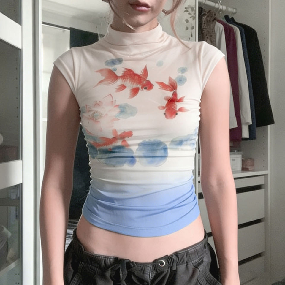 เสื้อยืดแขนสั้นผู้หญิงคอตั้งลายปลาทองวินเทจน่ารัก ระบายอากาศได้ดี เป็นมิตรกับสิ่งแวดล้อม คอลเลคชั่นใหม่รับซัมเมอร์