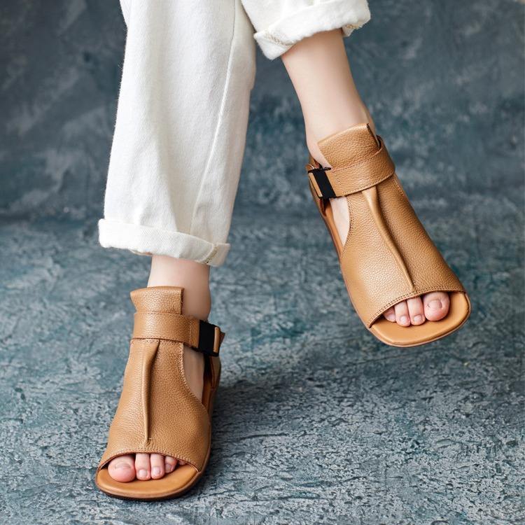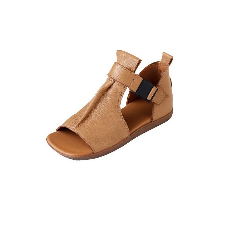 รองเท้าแตะรัดส้นแบบเปิดนิ้วเท้าสไตล์อังกฤษหนังวัวแท้ทำมือสำหรับฤดูร้อน รองเท้าสไตล์โรมันสำหรับผู้หญิง ส้นแบน
