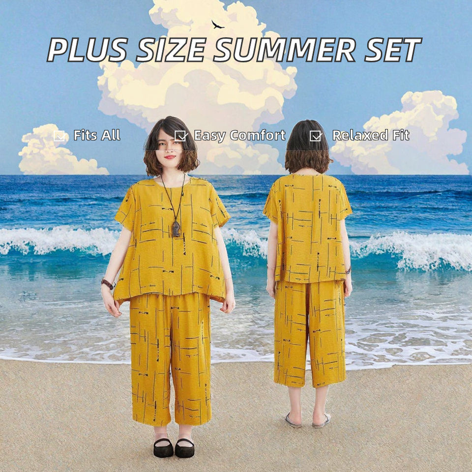 ชุดเซ็ตสองชิ้นสำหรับผู้หญิงไซส์พลัส ดีไซน์ใหม่รับซัมเมอร์ เสื้อฮู้ดแขนสั้นสีพื้นลำลอง กางเกงขายาวทรงหลวมรูดเชือก