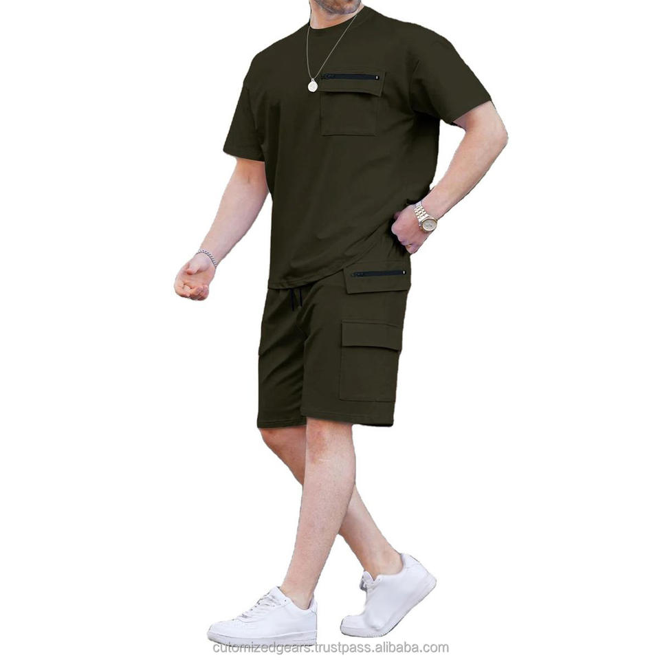 ชุดเซ็ตเสื้อยืดคอกลมแขนสั้นสีพื้นลำลองสำหรับผู้ชายฤดูร้อน พร้อมกางเกงขาสั้นหลายกระเป๋า แฟชั่นทันสมัย เหมาะสำหรับใส่เดินทาง ชุด 2 ชิ้น