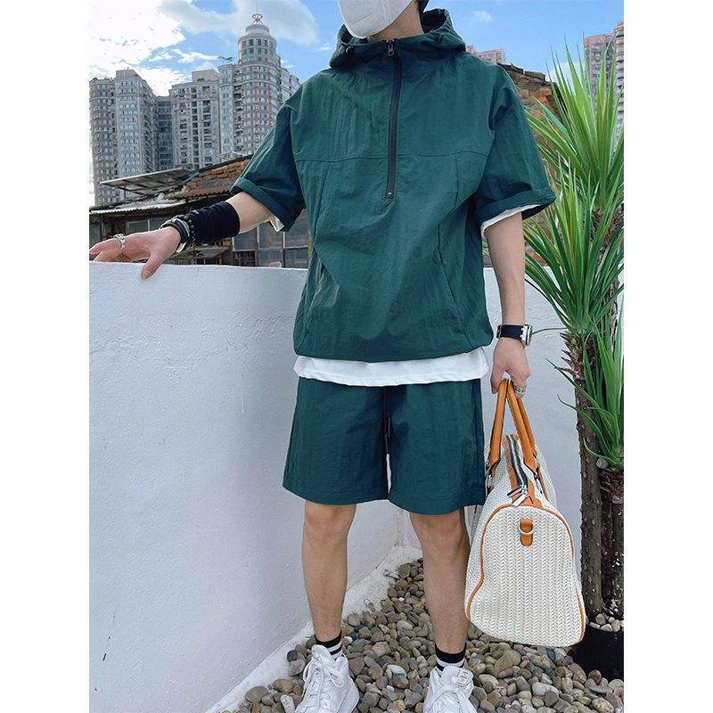 ชุดทำงานผู้ชายสองชิ้นแฟชั่นฤดูร้อน เสื้อฮู้ดสีพื้น กางเกงขาสั้น ชุดลำลองอเนกประสงค์ ทรงหลวม ซิป สวมใส่สบาย ทันสมัย