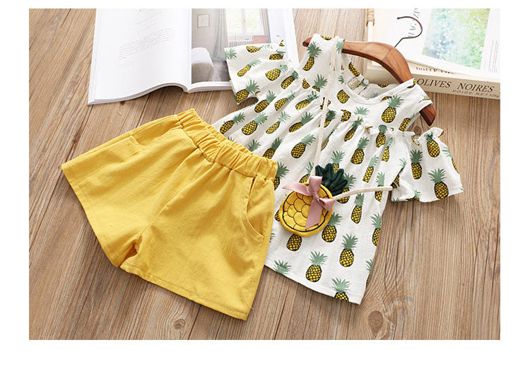 Summer New Pineapple Doll Shorts Bag Cotton Linen Clothing Kids Off Shoulder Beauty Girls Sets