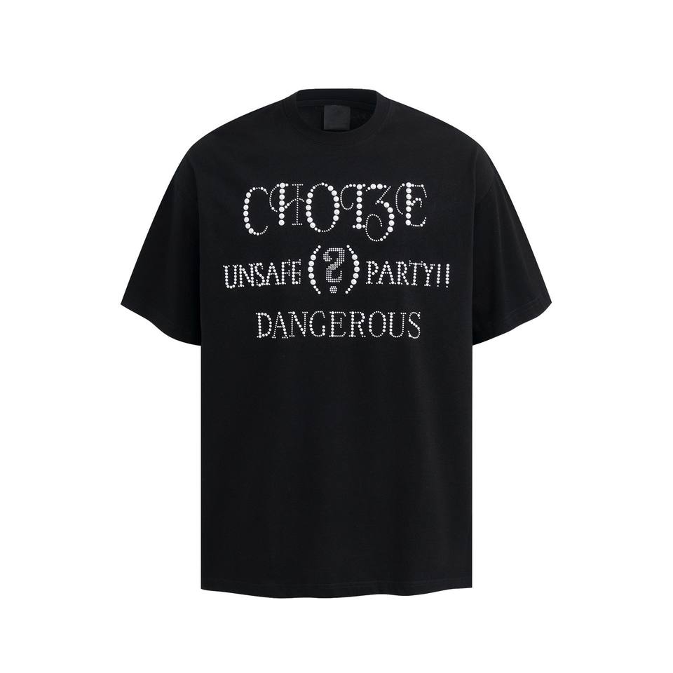 เสื้อยืดคอกลมแขนสั้นผู้ชายสไตล์โอเวอร์ไซส์ลายมุกติดพลอยเทียมใหม่ฤดูร้อน