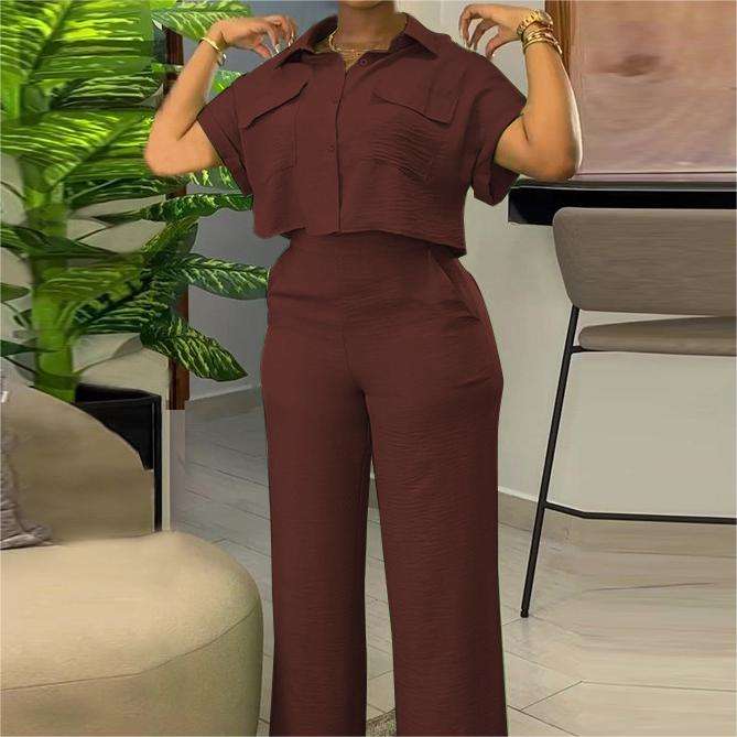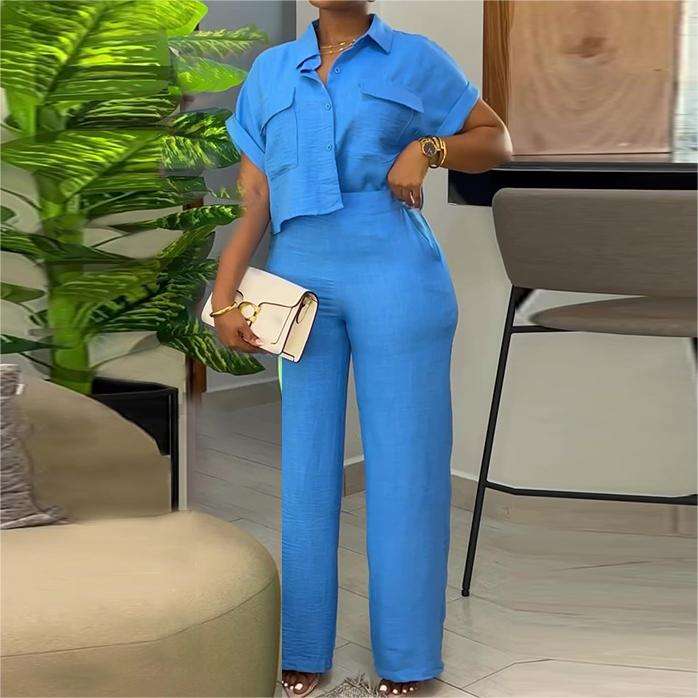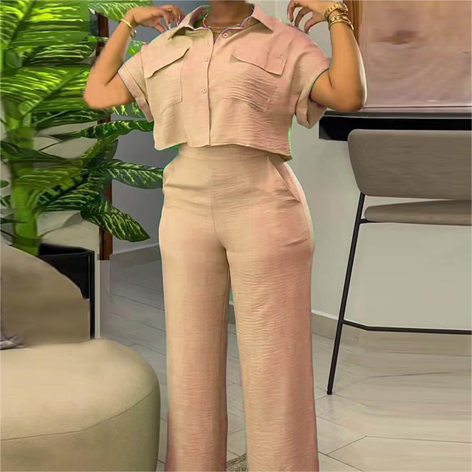 ชุดเซ็ต 2 ชิ้น เสื้อเชิ้ตแขนสั้นปกคอปกติดกระดุมสีพื้นสไตล์ลำลอง กางเกงขายาวทรงกว้าง แฟชั่นสำหรับผู้หญิง ประจำฤดูร้อน