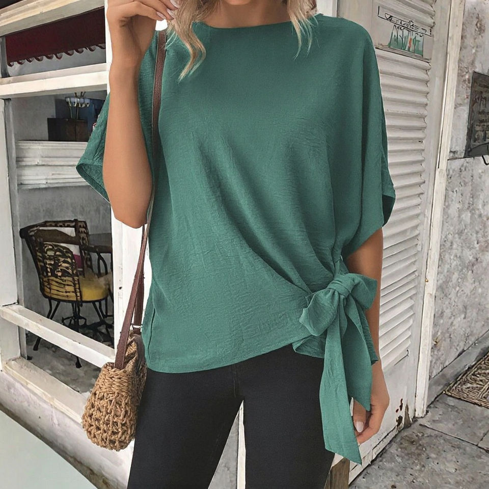 เสื้อยืดแขนทรงปีกค้างคาวสีพื้นแบบใหม่สำหรับฤดูร้อน แต่งชายเสื้อผูกปม ทรงหลวมสำหรับผู้หญิง แฟชั่นสไตล์ลำลอง ผ้าถัก