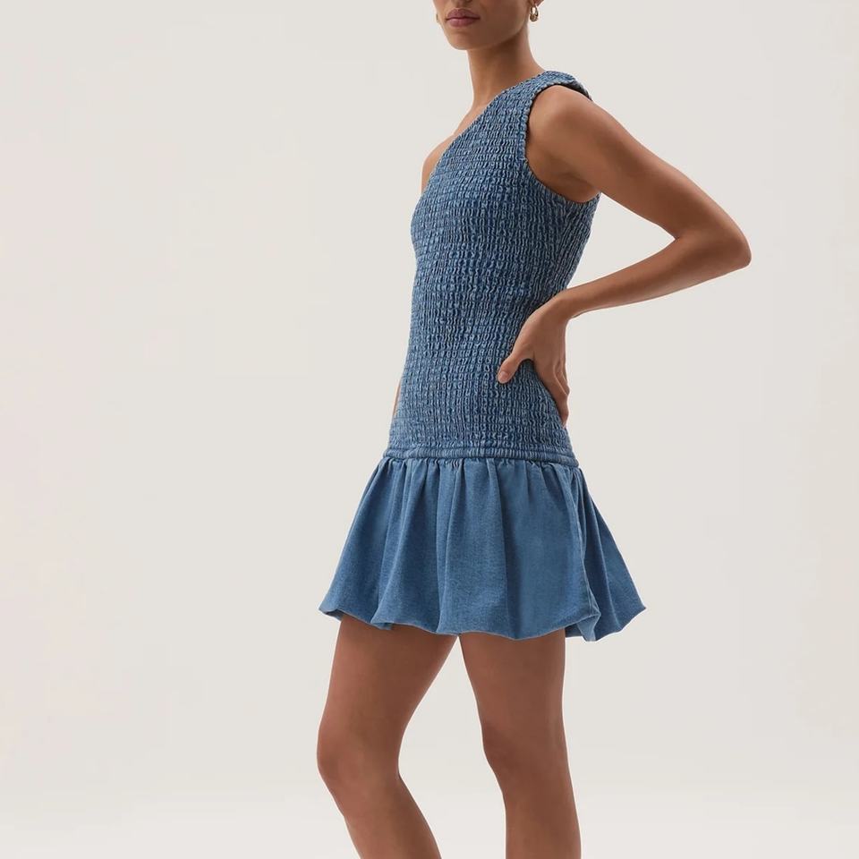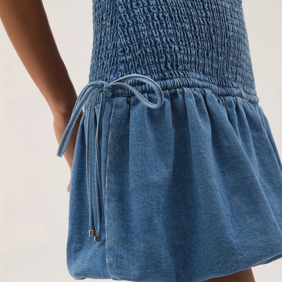 เดรสยีนส์มินิทรงเอแบบเรียบง่ายสำหรับผู้หญิง คอลเลคชั่นฤดูร้อน สายคล้องคอแบบผูกหลัง ไม่มีแขน ทรงบอลลูน ผ้าเดนิมฟอก