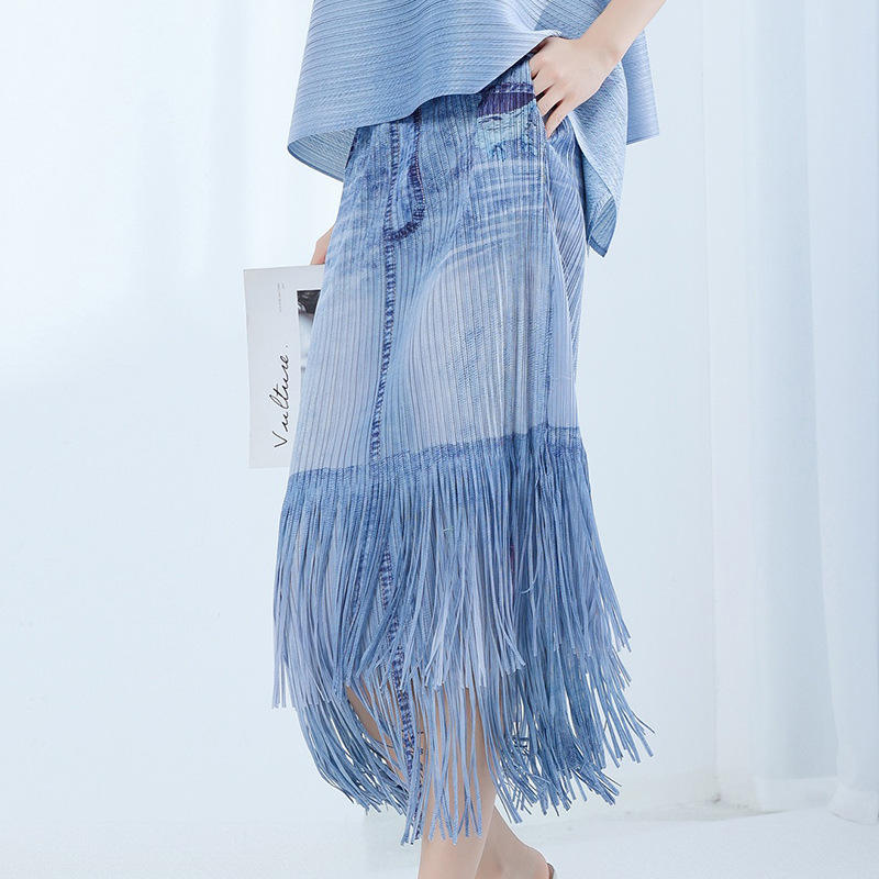 ชุดเซ็ต 2 ชิ้น เสื้อแขนกุดคอกลมประดับพู่ กระโปรงครึ่งตัว แฟชั่นฤดูร้อนสำหรับผู้หญิง