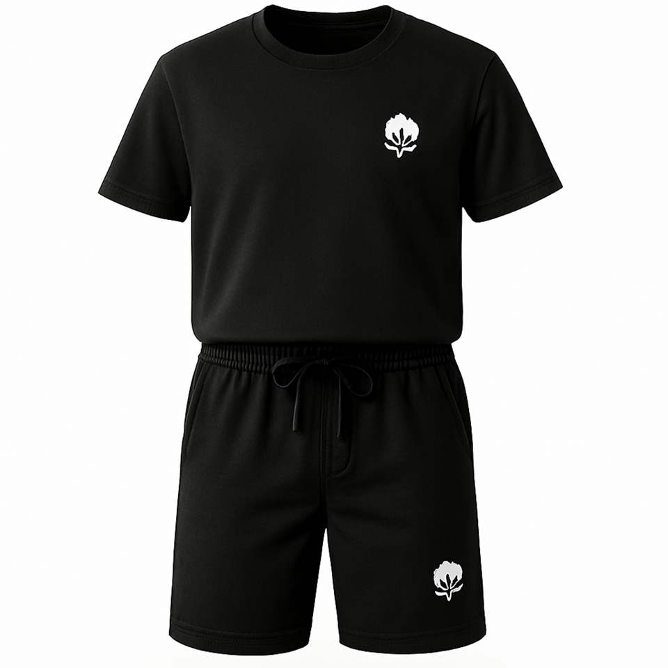 ชุดเซ็ตเสื้อยืดและกางเกงขาสั้นสีดำทรงโอเวอร์ไซส์สำหรับผู้ชาย ผ้าฝ้าย 100% สไตล์สตรีทแวร์ เหมาะสำหรับฤดูร้อน