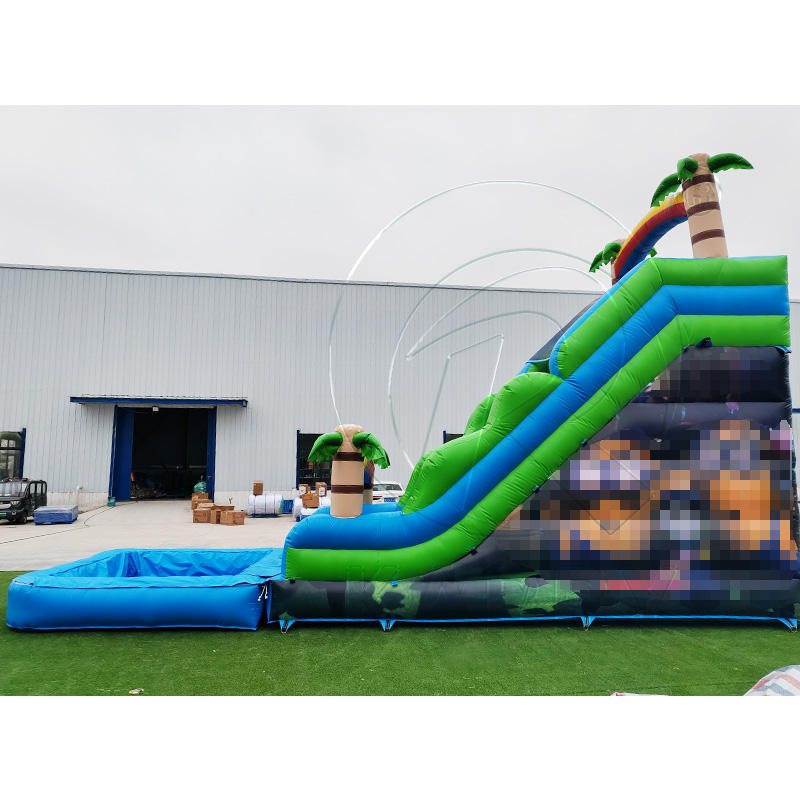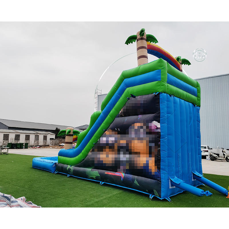 สไลเดอร์น้ำเป่าลมสีฟ้าสำหรับงานปาร์ตี้ฤดูร้อน รูปทรงต้นปาล์มเขตร้อน ขนาดสั่งทำได้ พร้อมสระน้ำถอดออกได้