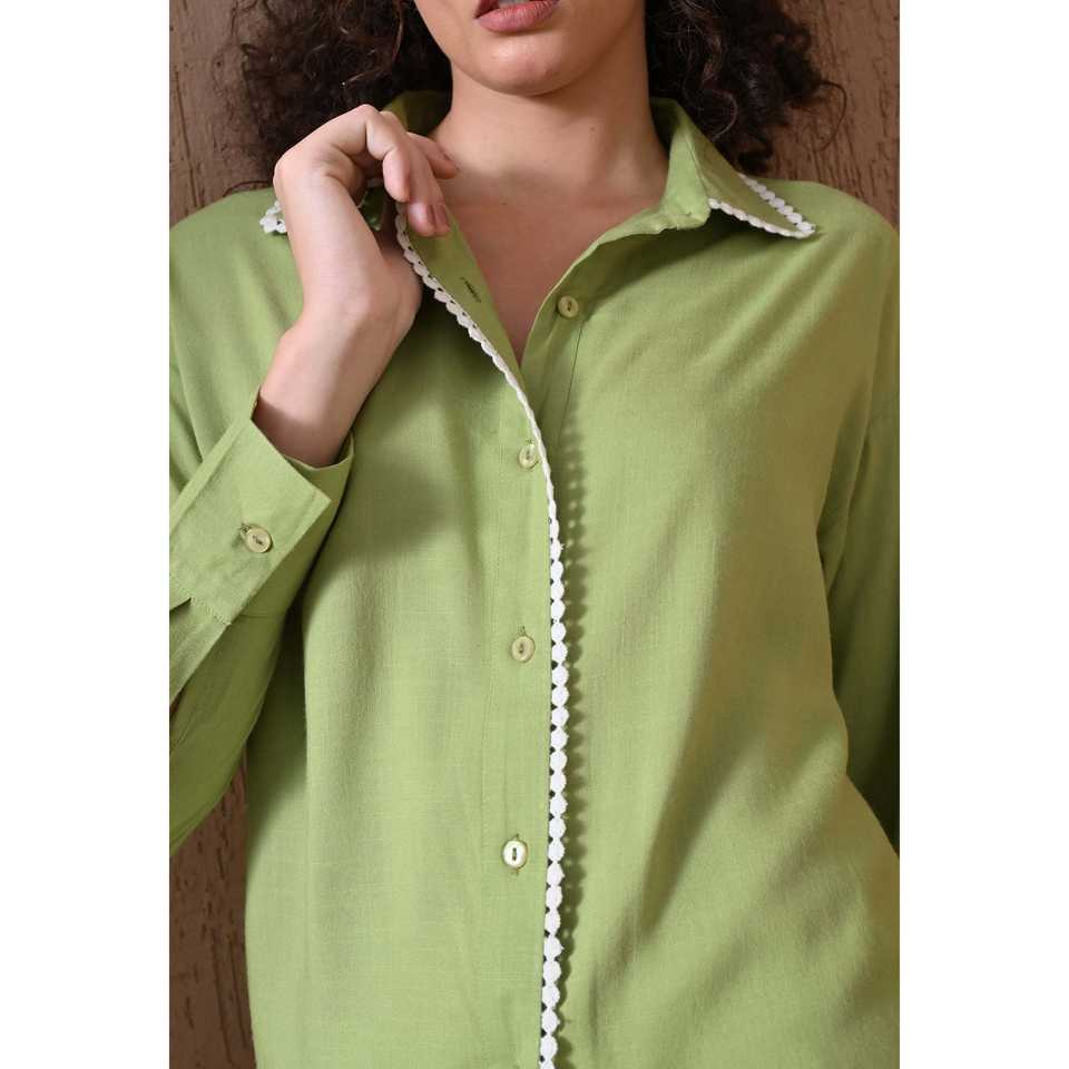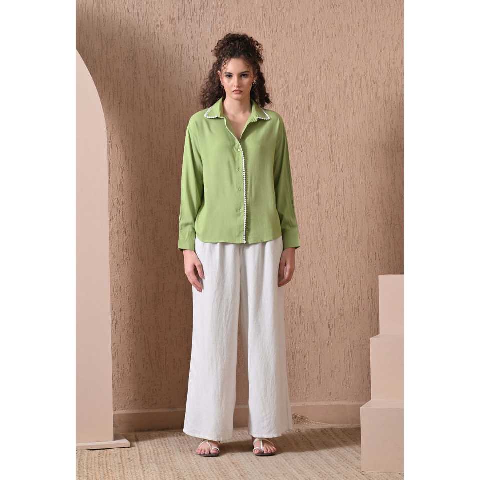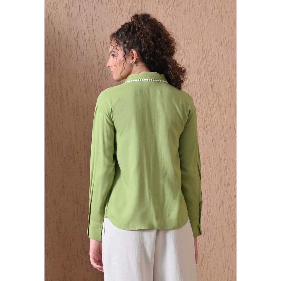 เสื้อวิสโคสสีเขียวสำหรับฤดูร้อนพร้อมลายปักสไตล์วินเทจสีล้วนย้อมสีอ่อนๆเสื้อโบฮีเมียนปกเสื้อออฟฟิศลำลอง