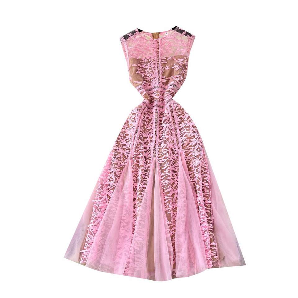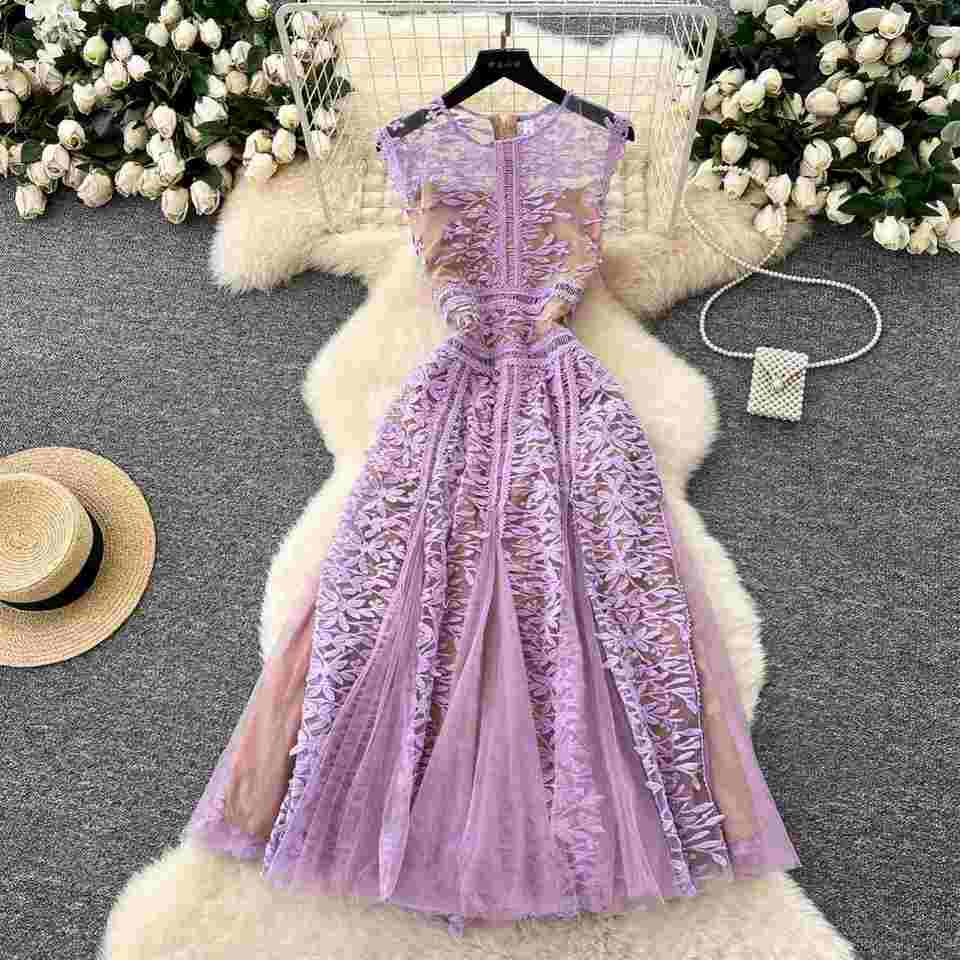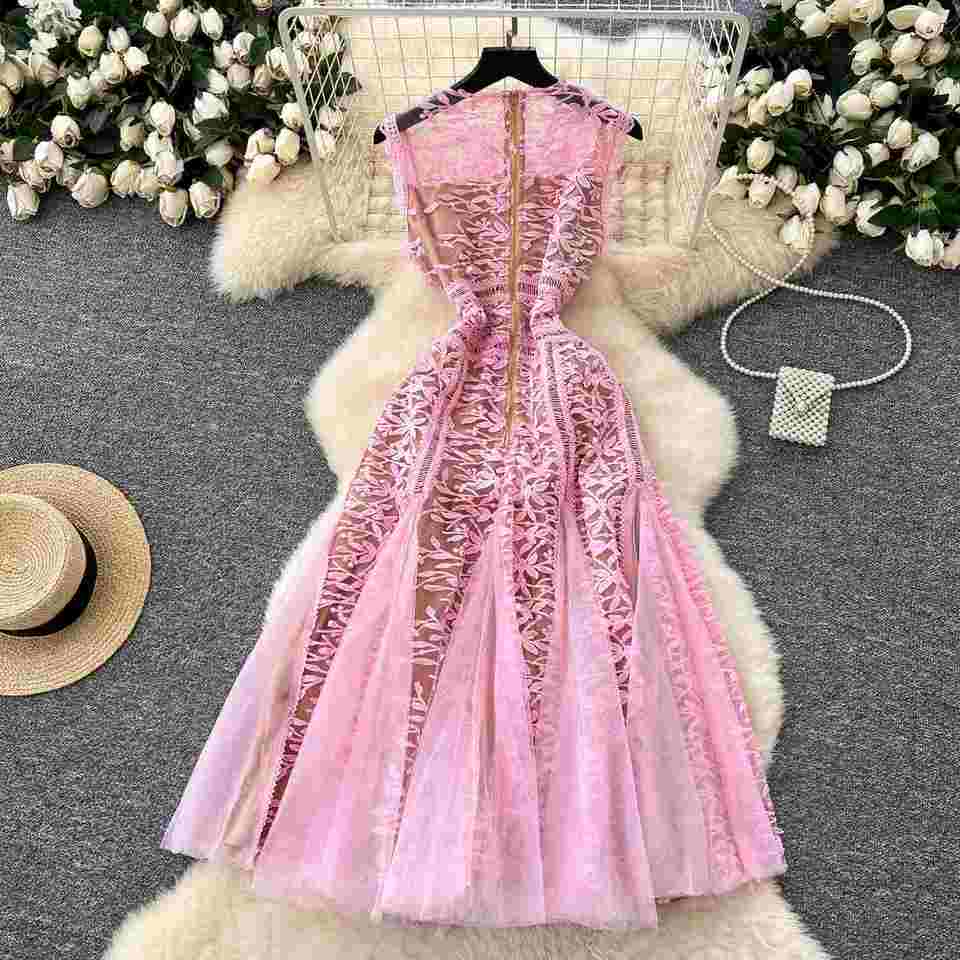 Summer Woven Roman O-Neck A-Line Slim Casual Midi Dress for Women Sleeveless Empire Embroidery Mesh Vestidos