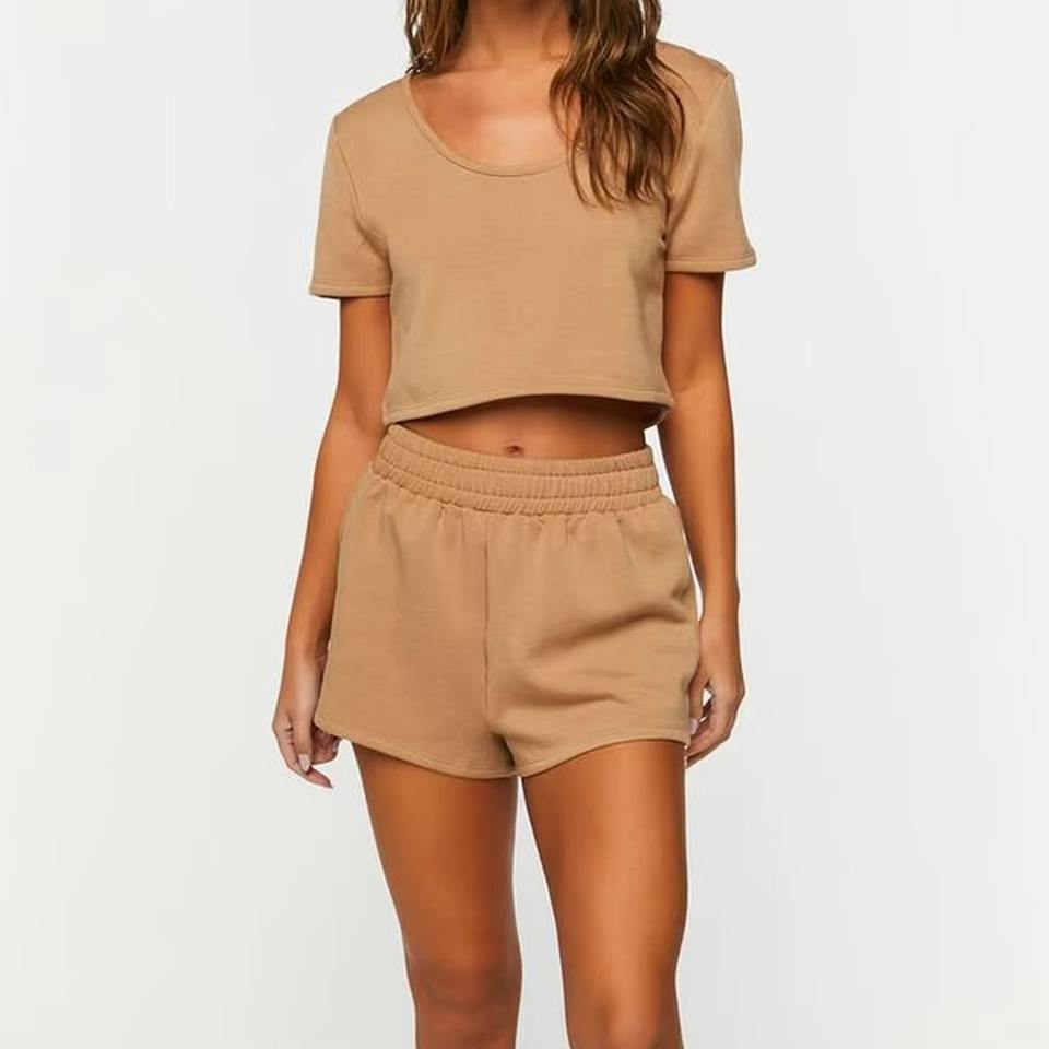 ชุดกีฬาฤดูร้อนสำหรับผู้หญิงปี 2025 ชุดเซ็ต 2 ชิ้น เสื้อครอปและกางเกงขาสั้น รับทำโลโก้ตามสั่ง บริการ OEM