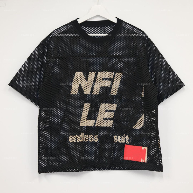 เสื้อยืดพิมพ์ลายโพลีเอสเตอร์ตาข่ายขนาดใหญ่เปิดไหล่แขนสั้นสำหรับผู้ชายเสื้อตาข่ายระบายอากาศได้ดีฤดูร้อน