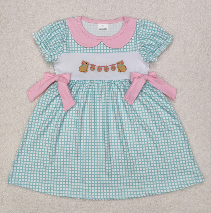 ชุดเดรสเด็กผู้หญิงลายจุดสีชมพูปักลายกระต่ายอีสเตอร์แขนสั้นสำหรับฤดูร้อน พร้อมชุดรอมเปอร์เข้าชุด